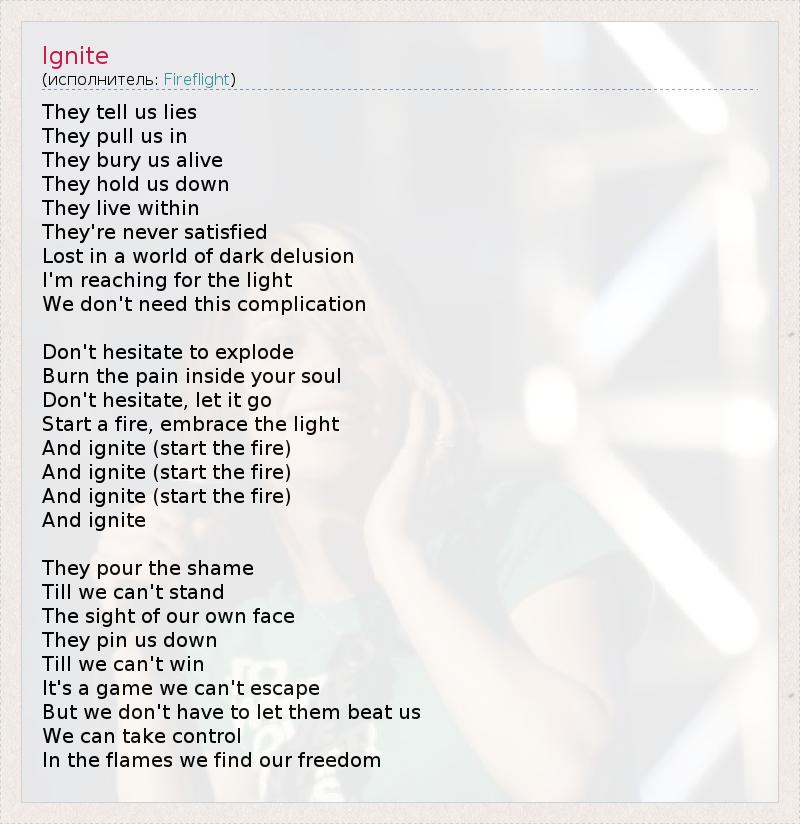 They tell us lies They pull us in They bury us alive They hold us down They live within They're never satisfied Lost in a world of dark delusion I'm reaching for the light We don't need this complication Don't hesitate to explode Burn the pain inside your soul Don't hesitate, let it go Start a fire, embrace the light And ignite (start the fire) And ignite (start the fire) And ignite (start the fire) And ignite They pour the shame Till we can't stand The sight of our own face They pin us down Till we can't win It's a game we can't escape But we don't have to let them beat us We can take control In the flames we find our freedom