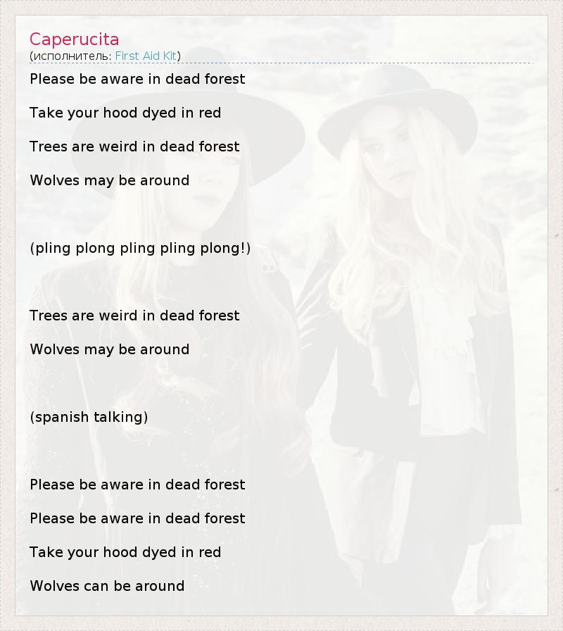 Это интересно:Существуют две группы с названием First Aid Kit:1) Испанский индитроника-дуэт с красивым женским вокалом. Состав: Agnès Aran (вокал) и Carles Querol (гитара и всё остальное). Записали два полноценных альбома: F1rst (2006) и Plaits (2008).2) Шведский дуэт сестёр Йоханны (1990 г.р.) и Клары (1993 г.р.) Сёдерберг. Играют лёгкий акустический фолк/кантри. В 2008 году выпустили EP под названием Drunken Trees, полноформатные The Big Black... продолжение