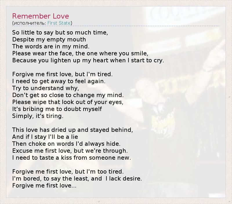 So little to say but so much time, Despite my empty mouth The words are in my mind. Please wear the face, the one where you smile, Because you lighten up my heart when I start to cry. Forgive me first love, but I'm tired. I need to get away to feel again. Try to understand why, Don't get so close to change my mind. Please wipe that look out of your eyes, It's bribing me to doubt myself Simply, it's tiring. This love has dried up and stayed behind, And if I stay I'll be a lie Then choke on words I'd always hide. Excuse me first love, but we're through. I need to taste a kiss from someone new. Forgive me first love, but I'm too tired. I'm bored, to say the least, and I lack desire. Forgive me first love...