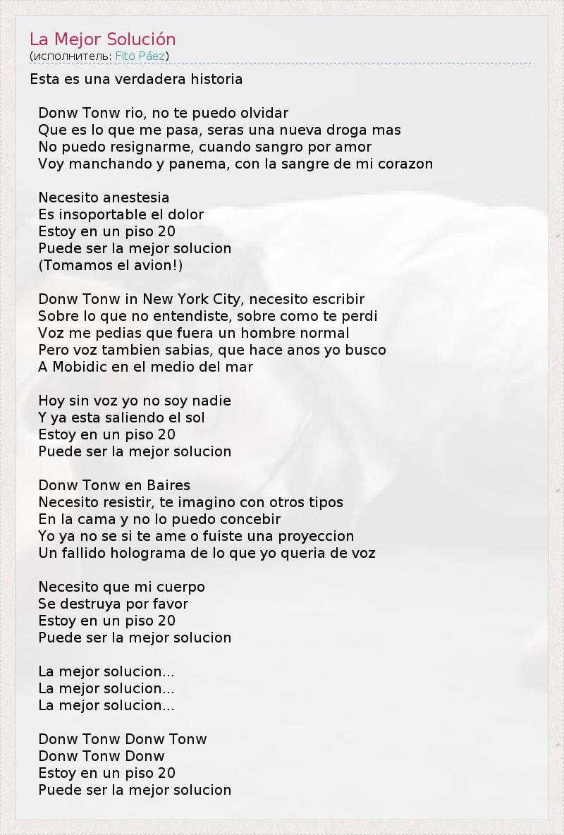 Esta es una verdadera historia Donw Tonw rio, no te puedo olvidar Que es lo que me pasa, seras una nueva droga mas No puedo resignarme, cuando sangro por amor Voy manchando y panema, con la sangre de mi corazon Necesito anestesia Es insoportable el dolor Estoy en un piso 20 Puede ser la mejor solucion (Tomamos el avion!) Donw Tonw in New York City, necesito escribir Sobre lo que no entendiste, sobre como te perdi Voz me pedias que fuera un hombre normal Pero voz tambien sabias, que hace anos yo busco A Mobidic en el medio del mar Hoy sin voz yo no soy nadie Y ya esta saliendo el sol Estoy en un piso 20 Puede ser la mejor solucion Donw Tonw en Baires Necesito resistir, te imagino con otros tipos En la cama y no lo puedo concebir Yo ya no se si te ame o fuiste una proyeccion Un fallido holograma de lo que yo queria de voz Necesito que mi cuerpo Se destruya por favor Estoy en un piso 20 Puede ser la mejor solucion La mejor solucion... La mejor solucion... La mejor solucion... Donw Tonw Donw Tonw Donw Tonw Donw Estoy en un piso 20 Puede ser la mejor solucion