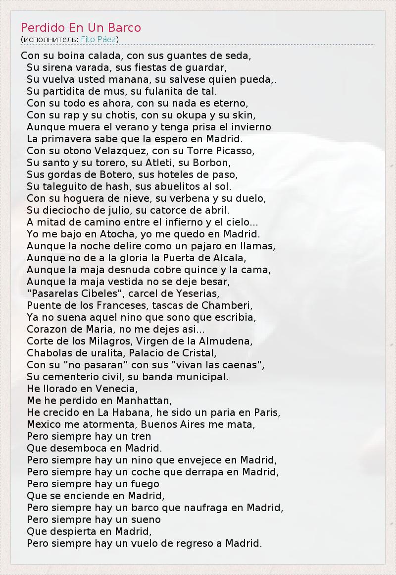 Con su boina calada, con sus guantes de seda, Su sirena varada, sus fiestas de guardar, Su vuelva usted manana, su salvese quien pueda,. Su partidita de mus, su fulanita de tal. Con su todo es ahora, con su nada es eterno, Con su rap y su chotis, con su okupa y su skin, Aunque muera el verano y tenga prisa el invierno La primavera sabe que la espero en Madrid. Con su otono Velazquez, con su Torre Picasso, Su santo y su torero, su Atleti, su Borbon, Sus gordas de Botero, sus hoteles de paso, Su taleguito de hash, sus abuelitos al sol. Con su hoguera de nieve, su verbena y su duelo, Su dieciocho de julio, su catorce de abril. A mitad de camino entre el infierno y el cielo... Yo me bajo en Atocha, yo me quedo en Madrid. Aunque la noche delire como un pajaro en llamas, Aunque no de a la gloria la Puerta de Alcala, Aunque la maja desnuda cobre quince y la cama, Aunque la maja vestida no se deje besar, "Pasarelas Cibeles", carcel de Yeserias, Puente de los Franceses, tascas de Chamberi, Ya no suena aquel nino que sono que escribia, Corazon de Maria, no me dejes asi... Corte de los Milagros, Virgen de la Almudena, Chabolas de uralita, Palacio de Cristal, Con su "no pasaran" con sus "vivan las caenas", Su cementerio civil, su banda municipal. He llorado en Venecia, Me he perdido en Manhattan, He crecido en La Habana, he sido un paria en Paris, Mexico me atormenta, Buenos Aires me mata, Pero siempre hay un tren Que desemboca en Madrid. Pero siempre hay un nino que envejece en Madrid, Pero siempre hay un coche que derrapa en Madrid, Pero siempre hay un fuego Que se enciende en Madrid, Pero siempre hay un barco que naufraga en Madrid, Pero siempre hay un sueno Que despierta en Madrid, Pero siempre hay un vuelo de regreso a Madrid.
