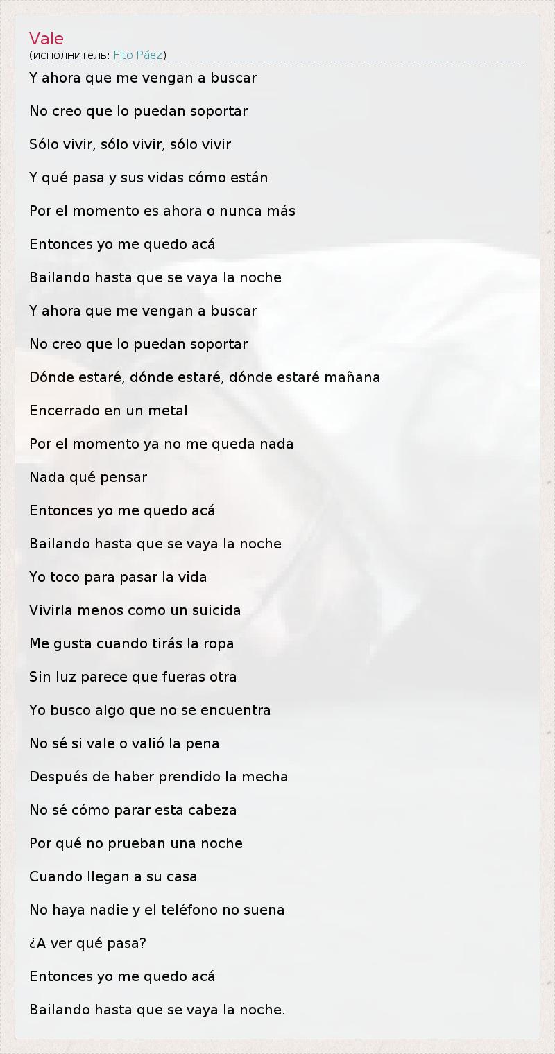 Y ahora que me vengan a buscar No creo que lo puedan soportar Sólo vivir, sólo vivir, sólo vivir Y qué pasa y sus vidas cómo están Por el momento es ahora o nunca más Entonces yo me quedo acá Bailando hasta que se vaya la noche Y ahora que me vengan a buscar No creo que lo puedan soportar Dónde estaré, dónde estaré, dónde estaré mañana Encerrado en un metal Por el momento ya no me queda nada Nada qué pensar Entonces yo me quedo acá Bailando hasta que se vaya la noche Yo toco para pasar la vida Vivirla menos como un suicida Me gusta cuando tirás la ropa Sin luz parece que fueras otra Yo busco algo que no se encuentra No sé si vale o valió la pena Después de haber prendido la mecha No sé cómo parar esta cabeza Por qué no prueban una noche Cuando llegan a su casa No haya nadie y el teléfono no suena ¿A ver qué pasa? Entonces yo me quedo acá Bailando hasta que se vaya la noche.