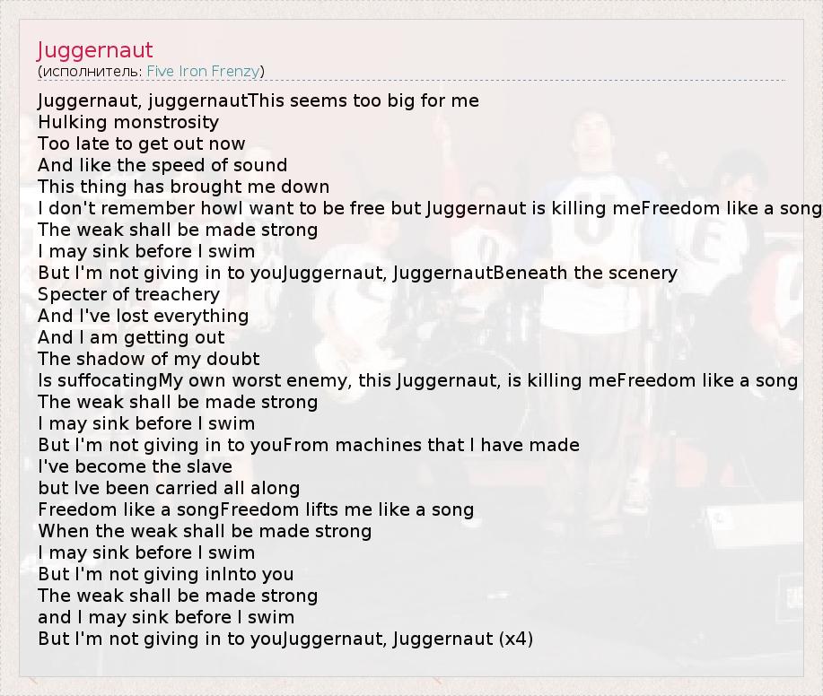I don't remember howI want to be free but Juggernaut is killing meFreedom like a song