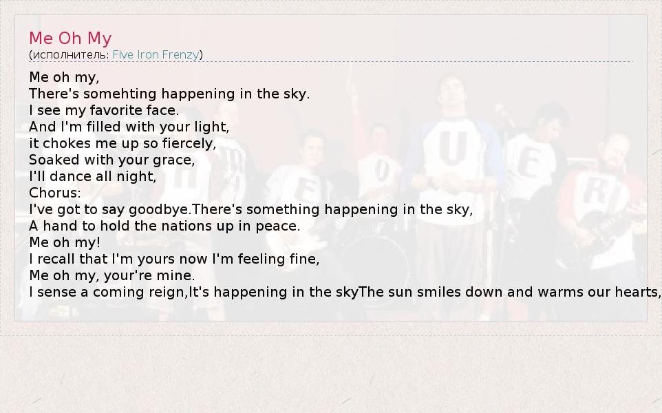 Me oh my, There's somehting happening in the sky. I see my favorite face. And I'm filled with your light, it chokes me up so fiercely, Soaked with your grace, I'll dance all night, Chorus: I've got to say goodbye.There's something happening in the sky, A hand to hold the nations up in peace. Me oh my! I recall that I'm yours now I'm feeling fine, Me oh my, your're mine. I sense a coming reign,It's happening in the skyThe sun smiles down and warms our hearts,