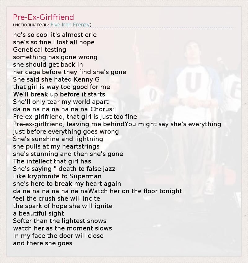 he's so cool it's almost erie she's so fine I lost all hope Genetical testing something has gone wrong she should get back in her cage before they find she's gone She said she hated Kenny G that girl is way too good for me We'll break up before it starts She'll only tear my world apart da na na na na na na na[Chorus:] Pre-ex-girlfriend, that girl is just too fine Pre-ex-girlfriend, leaving me behindYou might say she's everything just before everything goes wrong She's sunshine and lightning she pulls at my heartstrings she's stunning and then she's gone The intellect that girl has She's saying " death to false jazz Like kryptonite to Superman she's here to break my heart again da na na na na na na naWatch her on the floor tonight feel the crush she will incite the spark of hope she will ignite a beautiful sight Softer than the lightest snows watch her as the moment slows in my face the door will close and there she goes.