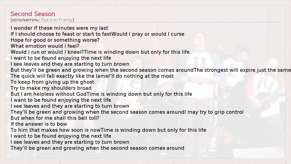 Это интересно:Five Iron Frenzy, октет из Денвера, штат Колорадо, начали собирать вокруг себя плотную и эклектическую фан-базу с самого своего зачатия в 1995. Сформировавшись из развеянного по ветру пепла индустриально-трэшевой банды Exhumator (Эксгуматор), Five Iron'ы быстро заслужили себе место и имя на Денверской клубной сцене. Отыграв 60 шоу за первые пару месяцев своего существования, они были замечены некоторыми... продолжение