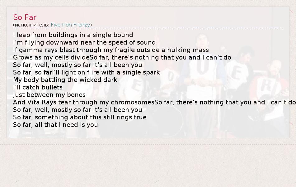 Это интересно:Five Iron Frenzy, октет из Денвера, штат Колорадо, начали собирать вокруг себя плотную и эклектическую фан-базу с самого своего зачатия в 1995. Сформировавшись из развеянного по ветру пепла индустриально-трэшевой банды Exhumator (Эксгуматор), Five Iron'ы быстро заслужили себе место и имя на Денверской клубной сцене. Отыграв 60 шоу за первые пару месяцев своего существования, они были замечены некоторыми... продолжение