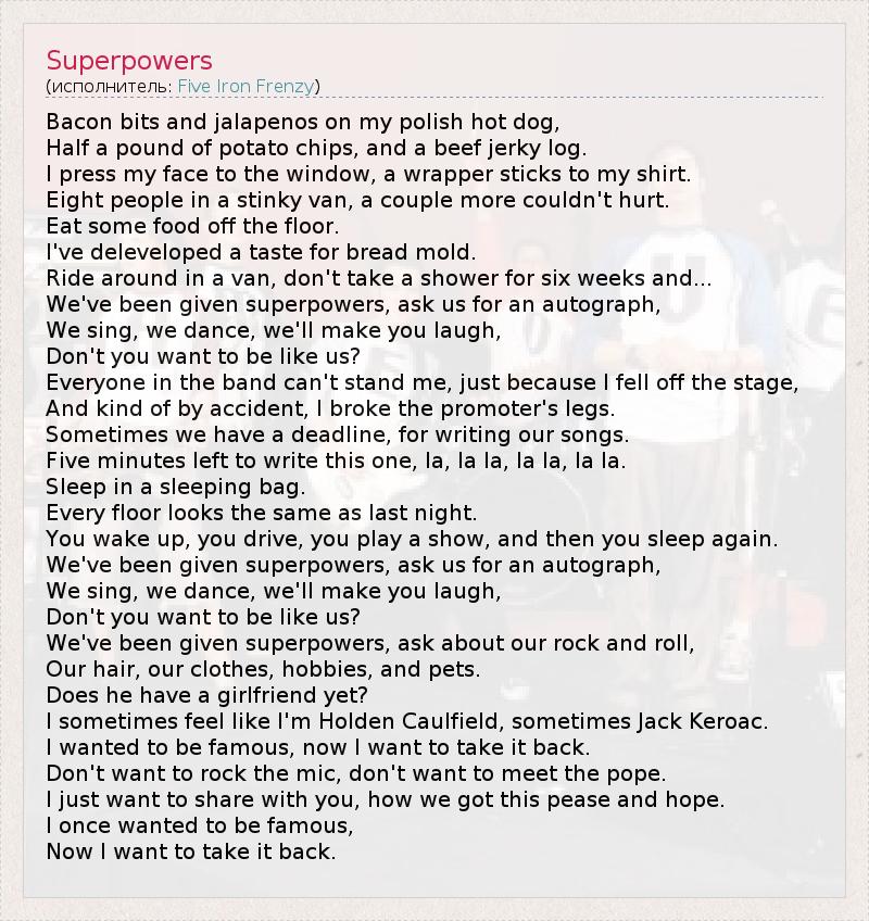 Это интересно:Five Iron Frenzy, октет из Денвера, штат Колорадо, начали собирать вокруг себя плотную и эклектическую фан-базу с самого своего зачатия в 1995. Сформировавшись из развеянного по ветру пепла индустриально-трэшевой банды Exhumator (Эксгуматор), Five Iron'ы быстро заслужили себе место и имя на Денверской клубной сцене. Отыграв 60 шоу за первые пару месяцев своего существования, они были замечены некоторыми... продолжение