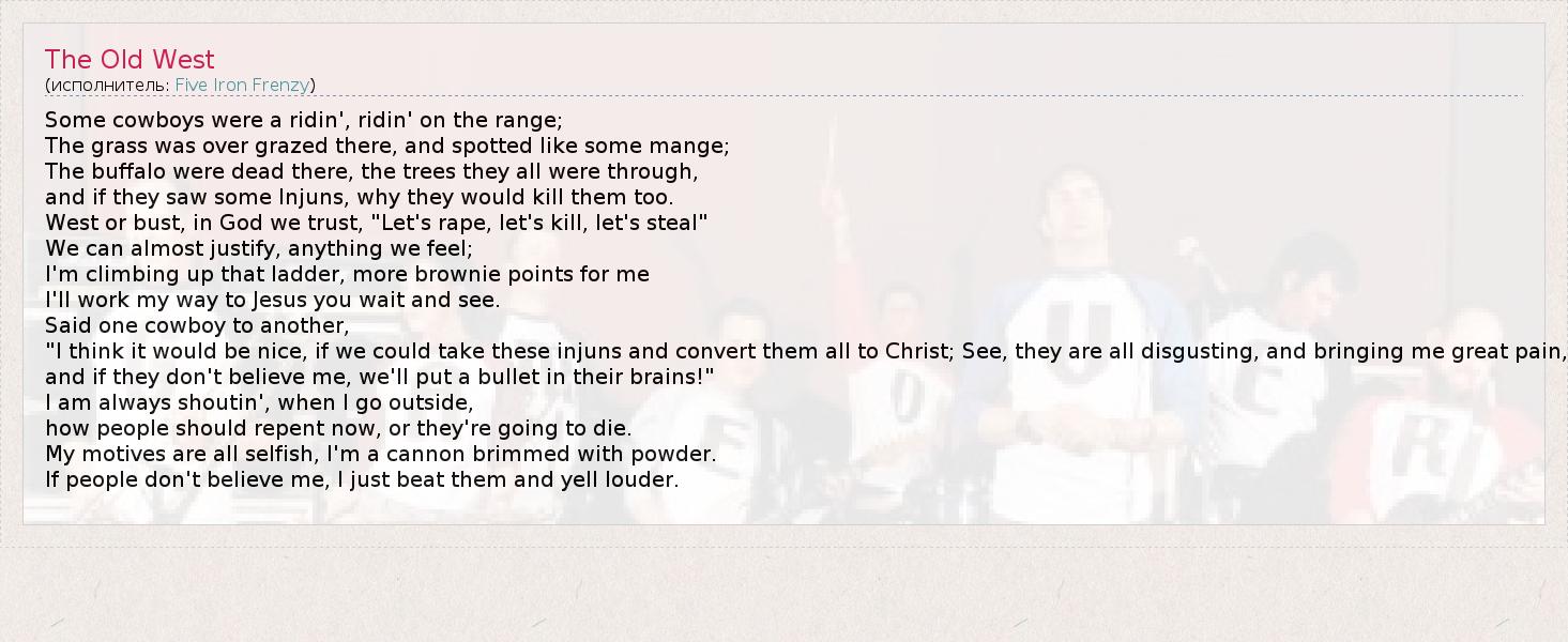Это интересно:Five Iron Frenzy, октет из Денвера, штат Колорадо, начали собирать вокруг себя плотную и эклектическую фан-базу с самого своего зачатия в 1995. Сформировавшись из развеянного по ветру пепла индустриально-трэшевой банды Exhumator (Эксгуматор), Five Iron'ы быстро заслужили себе место и имя на Денверской клубной сцене. Отыграв 60 шоу за первые пару месяцев своего существования, они были замечены некоторыми... продолжение