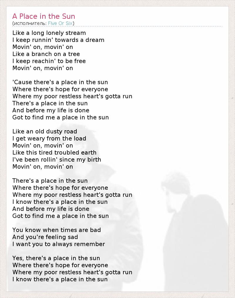 Like a long lonely stream I keep runnin' towards a dream Movin' on, movin' on Like a branch on a tree I keep reachin' to be free Movin' on, movin' on 'Cause there's a place in the sun Where there's hope for everyone Where my poor restless heart's gotta run There's a place in the sun And before my life is done Got to find me a place in the sun Like an old dusty road I get weary from the load Movin' on, movin' on Like this tired troubled earth I've been rollin' since my birth Movin' on, movin' on There's a place in the sun Where there's hope for everyone Where my poor restless heart's gotta run I know there's a place in the sun And before my life is done Got to find me a place in the sun You know when times are bad And you're feeling sad I want you to always remember Yes, there's a place in the sun Where there's hope for everyone Where my poor restless heart's gotta run I know there's a place in the sun
