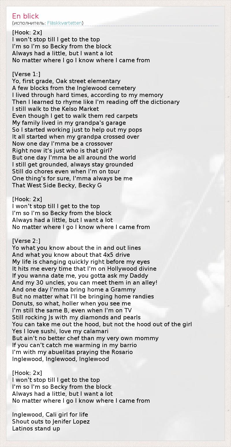 [Хук: 2x] Я не остановлюсь, пока не достигну вершины. Я вся такая из себя Бекки с района. Я всегда нуждалась, но я много хочу. Неважно, куда я иду, – я знаю, откуда я пришла. [1 куплет:] Йоу! Первый класс, начальная школа на Оак-стрит, 1 В нескольких кварталах от кладбища Инглвуд. 2 Насколько я помню, мне приходилось нелегко в жизни, Но потом я научилась рэповать, как будто я читаю словарь. Я продолжаю отовариваться в Kelso, 3 И хотя мне доводится ходить по красным дорожкам, Когда-то моя семья жила в гараже моего дедушки. Вот почему я пошла работать – просто чтобы помочь предкам. Всё это началось, когда дедушка ушел в мир иной. Когда-нибудь я стану кроссовером, 4 А пока я из серии: "Кто такая эта девчонка?" Когда-нибудь я прославлюсь на весь мир. Я продолжаю делать успехи, но никогда не теряю голову. Я продолжаю делать всё сама, даже когда у меня гастроли. В одном я уверена – я всегда останусь собой: Бекки, Бекки Джи с Вест-Сайда. 5 [Хук: 2x] Я не остановлюсь, пока не достигну вершины. Я вся такая из себя Бекки с района. Я всегда нуждалась, но я много хочу. Неважно, куда я иду, – я знаю, откуда я пришла. [2 куплет:] Йоу! Что вы знаете о том, когда ты в игре и когда ты вне игры? Что вы знаете о том, когда ты мчишься со скоростью света? Моя жизнь меняется прямо на глазах. Меня озаряет каждый раз, когда я блаженствую в Голливуде. Если хочешь пригласить меня на свидание, спроси у моего папы И у тридцати моих дядюшек. Ты можешь встретить их на улице. Когда-нибудь я принесу домой "Грэмми". А пока неважно, что я тащу домой: наркоту Или пончики. Какая разница? Поприветствуйте меня при встрече. Я всё та же Би, даже если меня показывают по телевизору. Рассекаю в "джорданах" с бриллиантами и жемчугами. Меня можно вытащить из гетто, но гетто нельзя вытащить из этой девчонки. Да, я люблю суши, и я люблю кальмаров, Но нет лучшего шеф-повара, чем моя любимая мама. Если не найдете меня прохлаждающейся на районе, Значит, я со своими бабушками, молюсь в соборе. Инглвуд, Инглвуд, Инглвуд. 6 [Хук: 2x] Я не остановлюсь, пока не достигну вершины. Я вся такая из себя Бекки с района. Я всегда нуждалась, но я много хочу. Неважно, куда я иду, – я знаю, откуда я пришла. Инглвуд, девчонка из Кали 7 с тобой навеки! Респект Дженнифер Лопез! 8 Латиносы, так держать! 1 – Оак-стрит – улица в Чикаго (США), на которой располагаются магазины класса "люкс", элитные спа-салоны и дорогие рестораны. 2 – Инглвуд-Парк – кладбище в Инглвуде, штат Калифорния. На нём похоронены многие известные личности (спортсмены, представители шоу-бизнеса, в частности Элла Фицджеральд). 3 – Kelso – сеть недорогих супермаркетов. 4 – Кроссовер – в американской звукозаписывающей индустрии: артист, имеющий контракты сразу с несколькими лейблами. 5 – Вест-Сайд – крупный район в западной части острова Манхэттен, США. 6 – Инглвуд – город на юго-западе округа Лос-Анджелес, штат Калифорния. 7 – Кали – сленговое название Калифорнии. 8 – Песня является кавером и одновременно пародией на композицию Дженнифер Лопез Jenny From The Block.