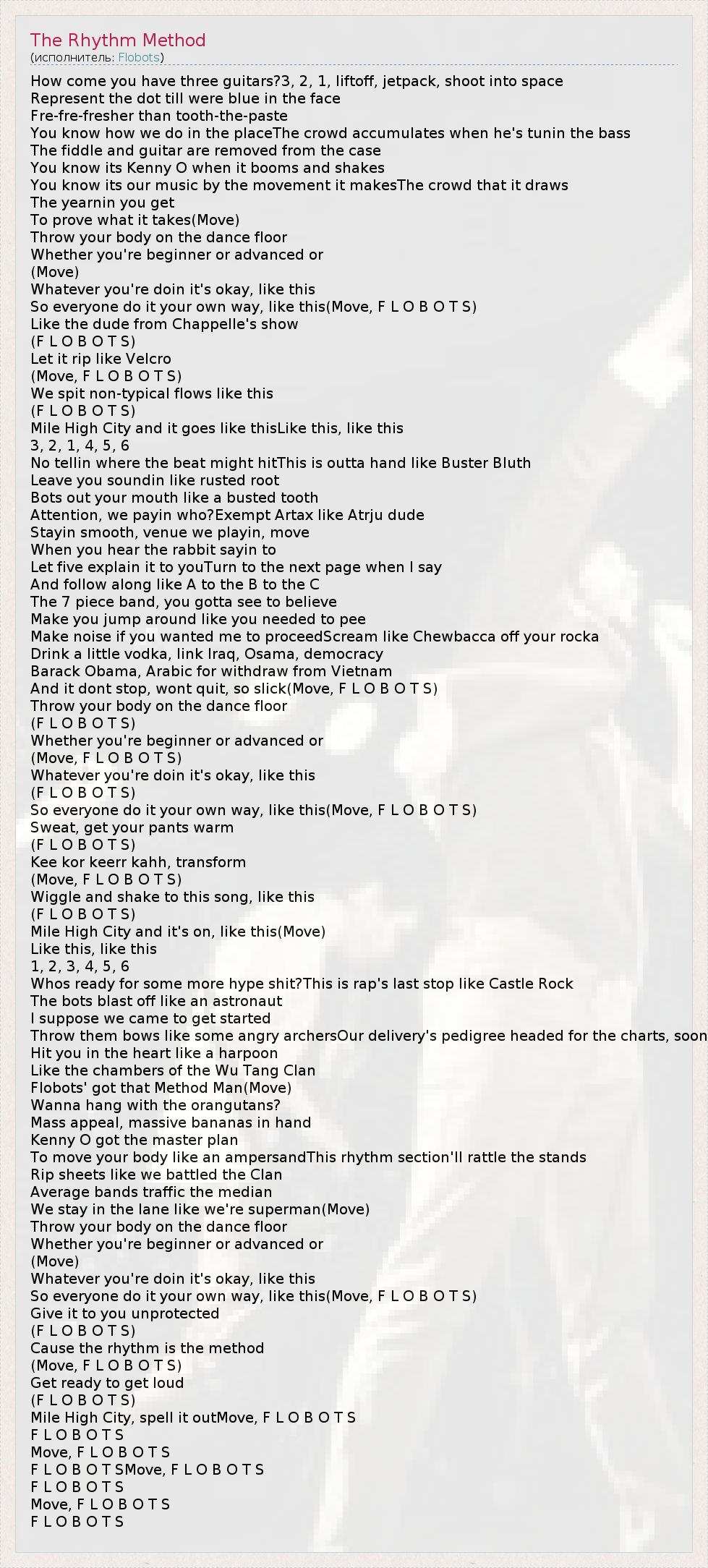 Это интересно:Flobots - американская группа из Денвера, Колорадо. Пятеро разноцветных мужчин и одна женщина играют альтернативный рок, щедро сдабривая его рэпом и фолком Альбом "Fight With Tools" – это третья полновесная работа коллектива и первая – на мейджоре. Старт на пятнадцатом месте Billboard был неплохим началом, а успех "Handlebars" на рок радиостанциях подкрепил его. Эта песня была записана три года... продолжение