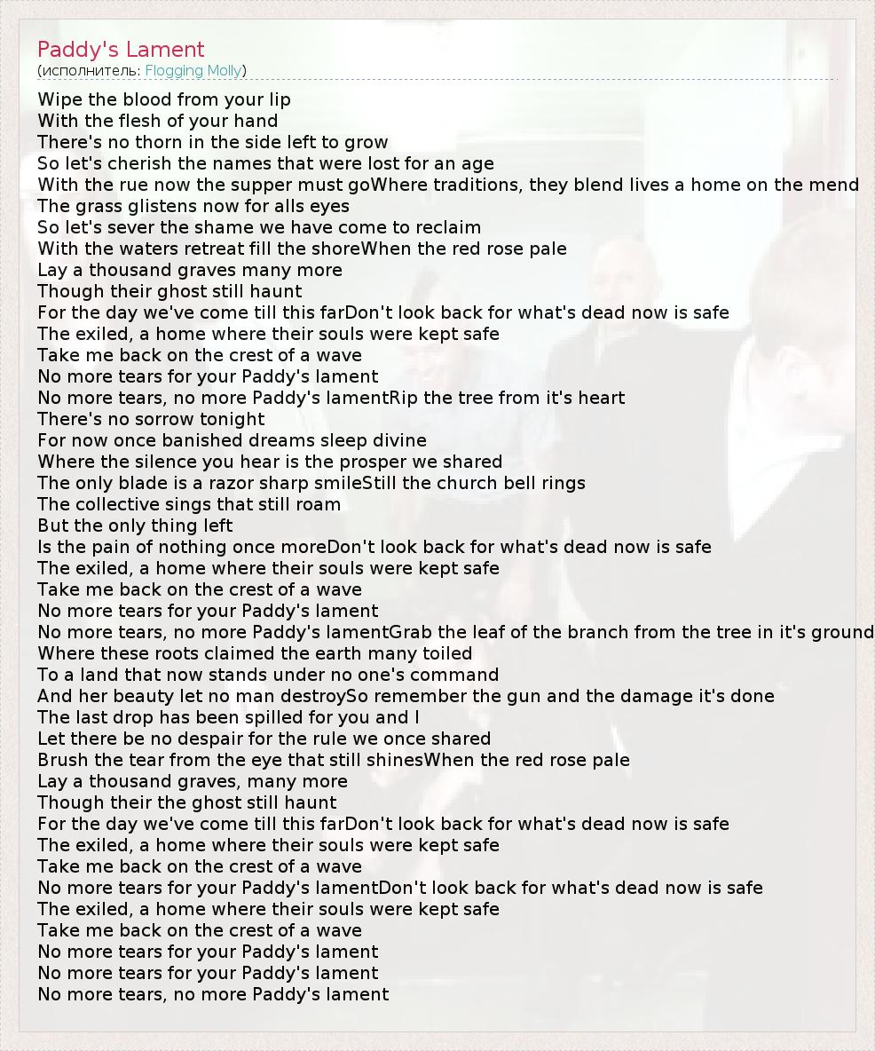 No more tears for your Paddy's lamentDon't look back for what's dead now is safe
