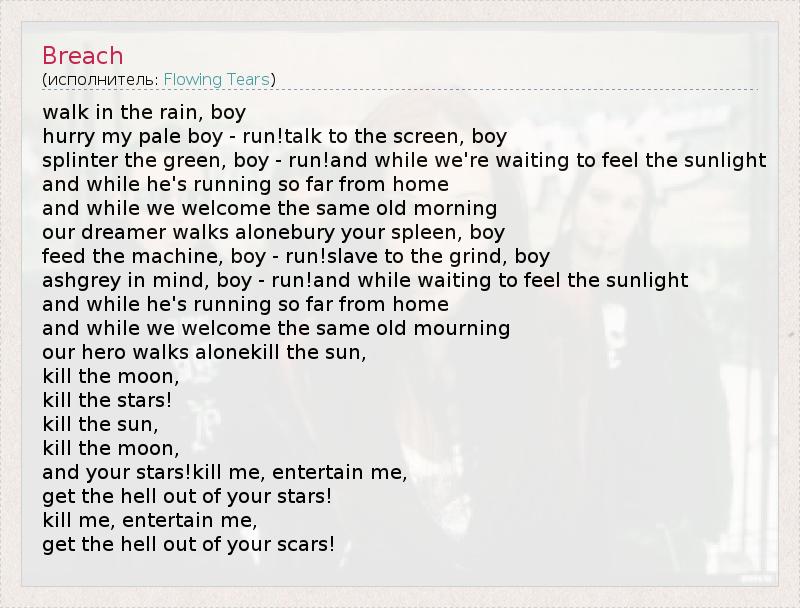 Это интересно:Flowing Tears — немецкая группа, играющая в стиле gothic metal, образованная в 1994 году в Вадгассене (нем. Wadgassen).Первоначально группа называлась Flowing Tears & Withered Flowers. Под этим названием они выпустили первые два альбома: Swansongs и Joy Parade. На альбоме Swansongs... продолжение
