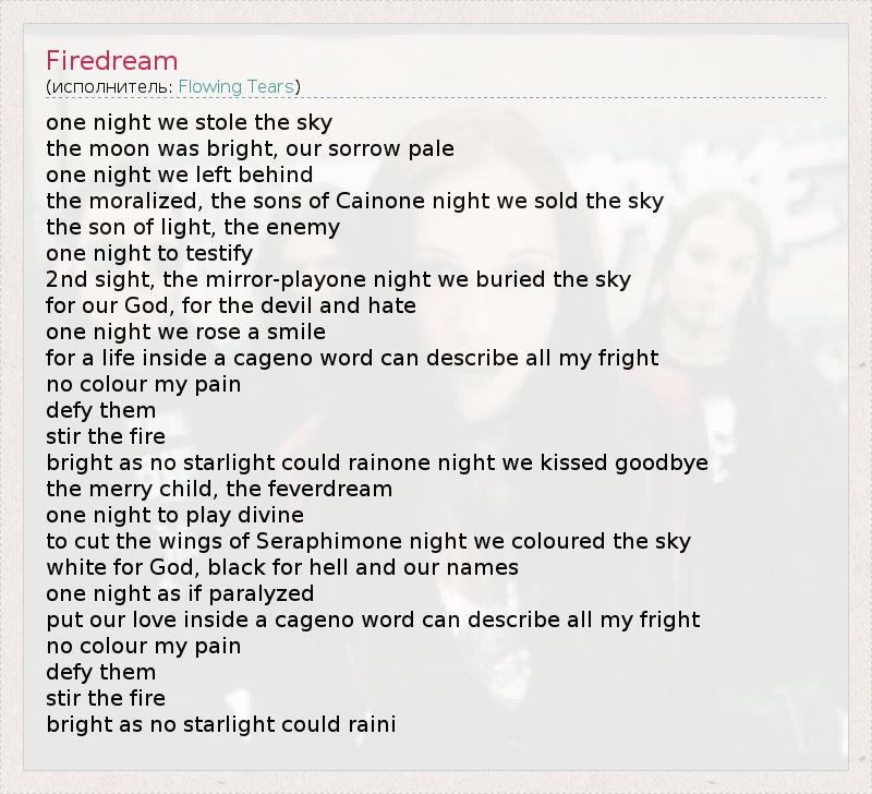 one night we stole the sky the moon was bright, our sorrow pale one night we left behind the moralized, the sons of Cainone night we sold the sky the son of light, the enemy one night to testify 2nd sight, the mirror-playone night we buried the sky for our God, for the devil and hate one night we rose a smile for a life inside a cageno word can describe all my fright no colour my pain defy them stir the fire bright as no starlight could rainone night we kissed goodbye the merry child, the feverdream one night to play divine to cut the wings of Seraphimone night we coloured the sky white for God, black for hell and our names one night as if paralyzed put our love inside a cageno word can describe all my fright no colour my pain defy them stir the fire bright as no starlight could raini