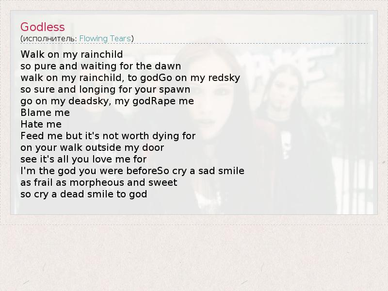 Walk on my rainchild so pure and waiting for the dawn walk on my rainchild, to godGo on my redsky so sure and longing for your spawn go on my deadsky, my godRape me Blame me Hate me Feed me but it's not worth dying for on your walk outside my door see it's all you love me for I'm the god you were beforeSo cry a sad smile as frail as morpheous and sweet so cry a dead smile to god