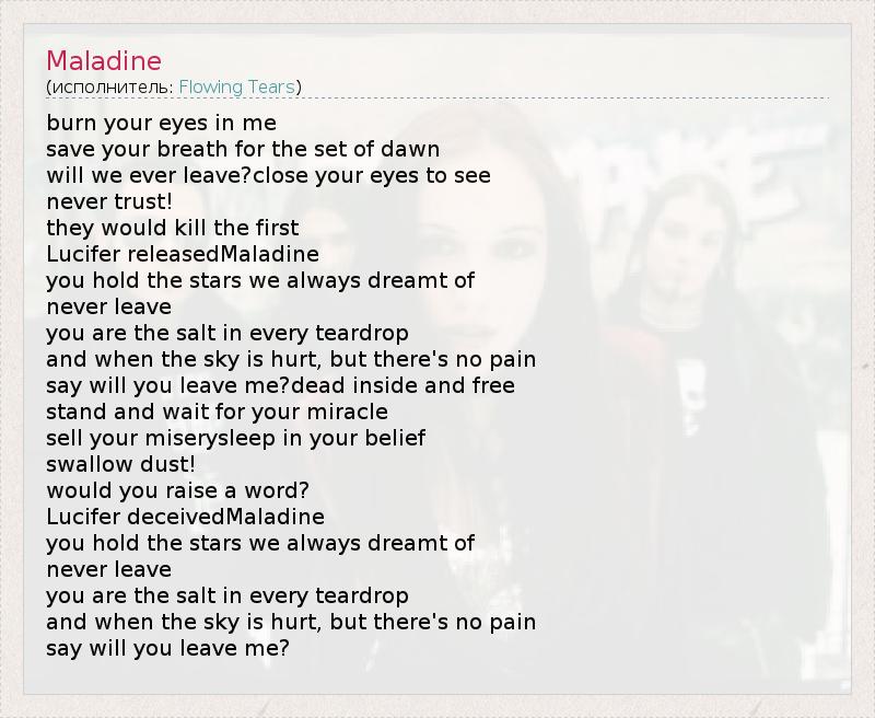 burn your eyes in me save your breath for the set of dawn will we ever leave?close your eyes to see never trust! they would kill the first Lucifer releasedMaladine you hold the stars we always dreamt of never leave you are the salt in every teardrop and when the sky is hurt, but there's no pain say will you leave me?dead inside and free stand and wait for your miracle sell your miserysleep in your belief swallow dust! would you raise a word? Lucifer deceivedMaladine you hold the stars we always dreamt of never leave you are the salt in every teardrop and when the sky is hurt, but there's no pain say will you leave me?