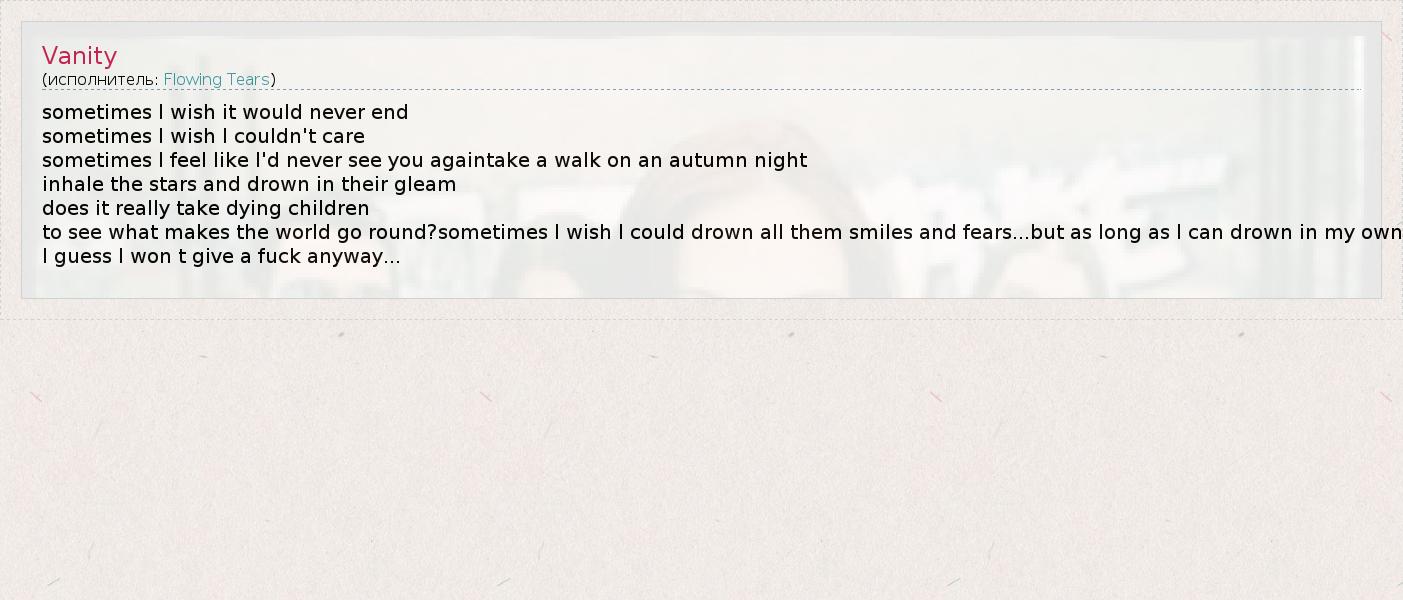 sometimes I wish it would never end sometimes I wish I couldn't care sometimes I feel like I'd never see you againtake a walk on an autumn night inhale the stars and drown in their gleam does it really take dying children to see what makes the world go round?sometimes I wish I could drown all them smiles and fears...but as long as I can drown in my own I guess I won t give a fuck anyway...