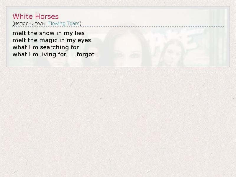Это интересно:Flowing Tears — немецкая группа, играющая в стиле gothic metal, образованная в 1994 году в Вадгассене (нем. Wadgassen).Первоначально группа называлась Flowing Tears & Withered Flowers. Под этим названием они выпустили первые два альбома: Swansongs и Joy Parade. На альбоме Swansongs... продолжение