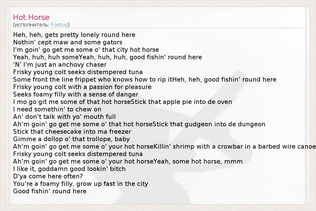 Heh, heh, gets pretty lonely round here Nothin' cept maw and some gators I'm goin' go get me some o' that city hot horse Yeah, huh, huh someYeah, huh, huh, good fishin' round here 'N' I'm just an anchovy chaser Frisky young colt seeks distempered tuna Some front the line frippet who knows how to rip itHeh, heh, good fishin' round here Frisky young colt with a passion for pleasure Seeks foamy filly with a sense of danger I mo go git me some of that hot horseStick that apple pie into de oven I need somethin' to chew on An' don't talk with yo' mouth full Ah'm goin' go get me some o' that hot horseStick that gudgeon into de dungeon Stick that cheesecake into ma freezer Gimme a dollop o' that trollope, baby Ah'm goin' go get me some o' your hot horseKillin' shrimp with a crowbar in a barbed wire canoe Frisky young colt seeks distempered tuna Ah'm goin' go get me some o' your hot horseYeah, some hot horse, mmm I like it, goddamn good lookin' bitch D'ya come here often? You're a foamy filly, grow up fast in the city Good fishin' round here