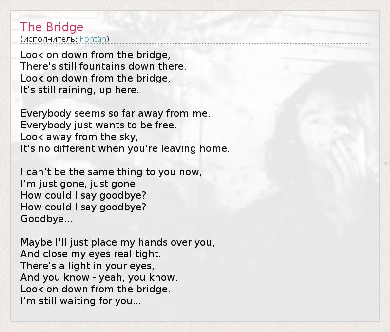 Look on down from the bridge, There's still fountains down there. Look on down from the bridge, It's still raining, up here. Everybody seems so far away from me. Everybody just wants to be free. Look away from the sky, It's no different when you're leaving home. I can't be the same thing to you now, I'm just gone, just gone How could I say goodbye? How could I say goodbye? Goodbye... Maybe I'll just place my hands over you, And close my eyes real tight. There's a light in your eyes, And you know - yeah, you know. Look on down from the bridge. I'm still waiting for you...