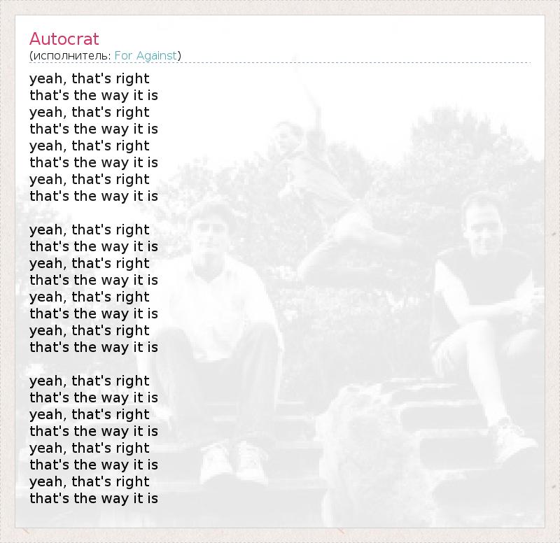 Это интересно:For Against это post-punk/proto-shoegaze группа из города Линкольн, штат Небраска (США). собрались в 1984 году и играли до 1998. Воссоединились в 2002 и продолжают играть и по сей день.Jeffrey Runnings (vocals, bass guitar, some guitar, 1984-present)Harry Dingman (guitar, 1984-89; ~2004-present)Nick Buller (drums, 2007-present)дискография:Autocrat (Republic Issue, 1985) 7''Echelons (IPR, 1987) LP/CassetteDecember (IPR, 1988) CD/LP/CassetteIn the Marshes (IPR, 1990) 10''You Only Live Twice (Part Trance,... продолжение