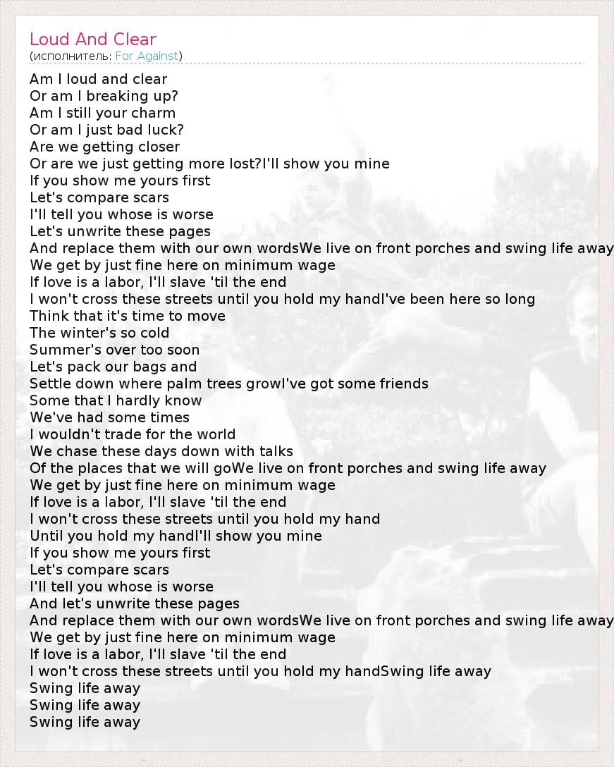 Am I loud and clear Or am I breaking up? Am I still your charm Or am I just bad luck? Are we getting closer Or are we just getting more lost?I'll show you mine If you show me yours first Let's compare scars I'll tell you whose is worse Let's unwrite these pages And replace them with our own wordsWe live on front porches and swing life away We get by just fine here on minimum wage If love is a labor, I'll slave 'til the end I won't cross these streets until you hold my handI've been here so long Think that it's time to move The winter's so cold Summer's over too soon Let's pack our bags and Settle down where palm trees growI've got some friends Some that I hardly know We've had some times I wouldn't trade for the world We chase these days down with talks Of the places that we will goWe live on front porches and swing life away We get by just fine here on minimum wage If love is a labor, I'll slave 'til the end I won't cross these streets until you hold my hand Until you hold my handI'll show you mine If you show me yours first Let's compare scars I'll tell you whose is worse And let's unwrite these pages And replace them with our own wordsWe live on front porches and swing life away We get by just fine here on minimum wage If love is a labor, I'll slave 'til the end I won't cross these streets until you hold my handSwing life away Swing life away Swing life away Swing life away