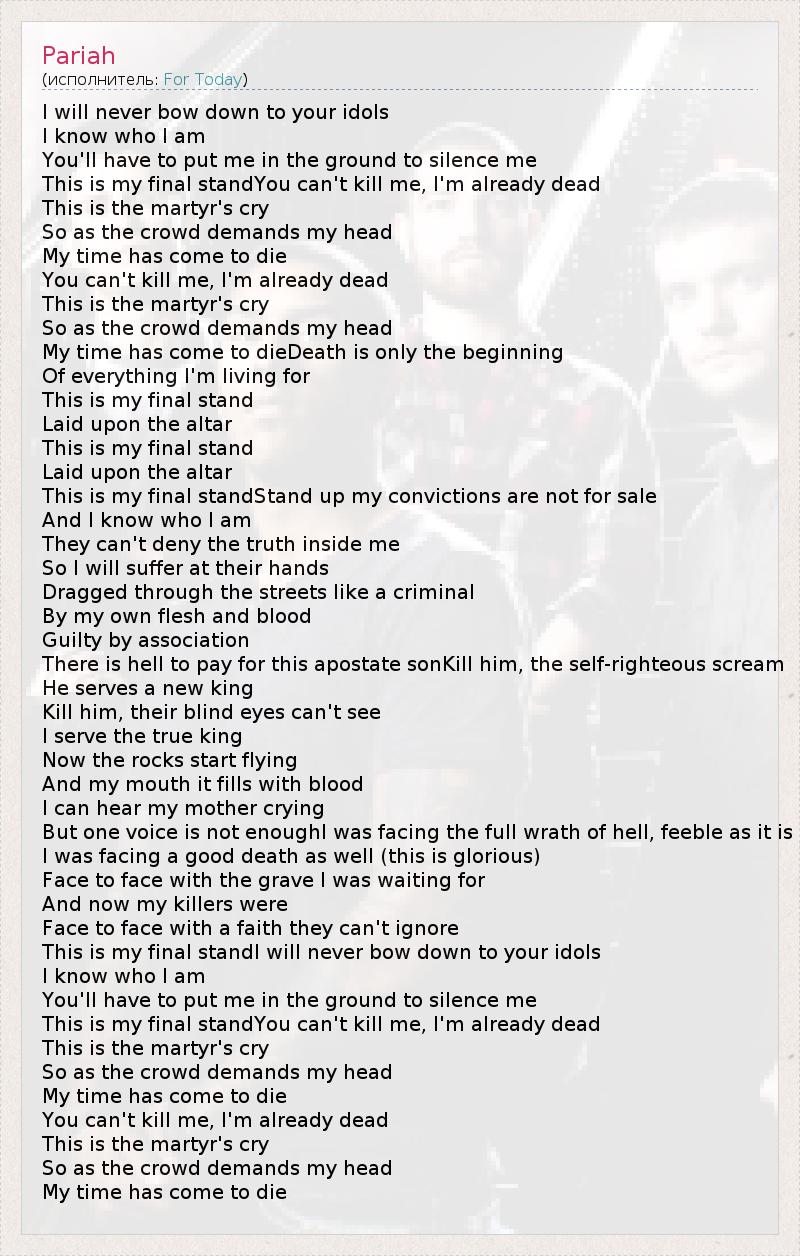 I will never bow down to your idols I know who I am You'll have to put me in the ground to silence me This is my final standYou can't kill me, I'm already dead This is the martyr's cry So as the crowd demands my head My time has come to die You can't kill me, I'm already dead This is the martyr's cry So as the crowd demands my head My time has come to dieDeath is only the beginning Of everything I'm living for This is my final stand Laid upon the altar This is my final stand Laid upon the altar This is my final standStand up my convictions are not for sale And I know who I am They can't deny the truth inside me So I will suffer at their hands Dragged through the streets like a criminal By my own flesh and blood Guilty by association There is hell to pay for this apostate sonKill him, the self-righteous scream He serves a new king Kill him, their blind eyes can't see I serve the true king Now the rocks start flying And my mouth it fills with blood I can hear my mother crying But one voice is not enoughI was facing the full wrath of hell, feeble as it is I was facing a good death as well (this is glorious) Face to face with the grave I was waiting for And now my killers were Face to face with a faith they can't ignore This is my final standI will never bow down to your idols I know who I am You'll have to put me in the ground to silence me This is my final standYou can't kill me, I'm already dead This is the martyr's cry So as the crowd demands my head My time has come to die You can't kill me, I'm already dead This is the martyr's cry So as the crowd demands my head My time has come to die