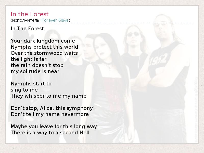 In The Forest "...В Лесу" Твой мрачный загробный мир Что нимфы неустанно хранят В вереске ждут далекого света В вечном дожде и моем одиночестве Нимфы начинают свою песню Они зовут меня к себе, во тьму Не прекращай, Алиса, эту симфонию! Не произноси больше никогда мое имя Может, ты уйдешь ради другого пути Что приведет тебя совсем в другой Ад