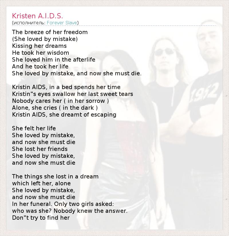 The breeze of her freedom (She loved by mistake) Kissing her dreams He took her wisdom She loved him in the afterlife And he took her life She loved by mistake, and now she must die. Kristin AIDS, in a bed spends her time Kristin"s eyes swallow her last sweet tears Nobody cares her ( in her sorrow ) Alone, she cries ( in the dark ) Kristin AIDS, she dreamt of escaping She felt her life She loved by mistake, and now she must die She lost her friends She loved by mistake, and now she must die The things she lost in a dream which left her, alone She loved by mistake, and now she must die In her funeral. Only two girls asked: who was she? Nobody knew the answer. Don"t try to find her