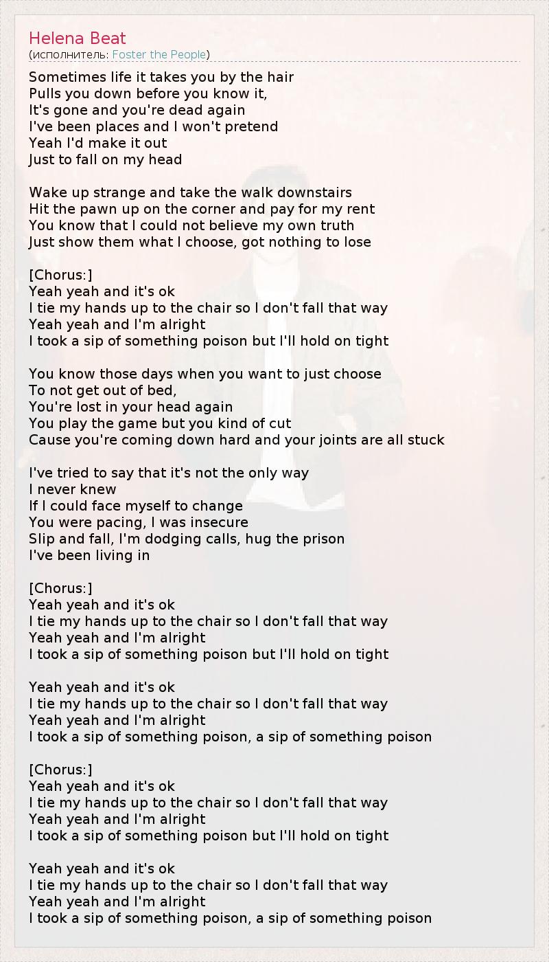 Иногда жизнь хватает тебя за волосы, Сбивает с ног прежде, чем ты успеваешь осознать это. Всё пропало, и ты снова мёртв. Я много где побывал и не буду лукавить, Да, я это понимал, Но всякий раз терпел неудачу. Я просыпаюсь со странным чувством, спускаюсь вниз, Прошу на углу денег взаймы и плачу за аренду; Знаешь, я не мог поверить своей собственной правде, Я просто показываю всем свой выбор, мне нечего терять. [Припев:] Да-да, и всё отлично, Я привязываю свои руки к стулу - так я не упаду; Да-да, и я в порядке, Я глотнул яду, но я буду держаться до последнего. Ты знавала такие дни, когда просто хочется выбирать ... Когда хочется не вставать с кровати; И ты снова вся в своих мыслях. Ты участвуешь в игре, но ты в ней – лишь пешка, Ведь ты терпишь поражения, и твои суставы скованы. Я пытался говорить, что это не единственный путь; Я никогда не знал, Могу ли я вступить в борьбу с самим собой, чтобы измениться. Ты шагала туда-сюда, я находился в опасности, Промах, падение, я избегаю звонков, крепко держусь за тюрьму, В которой живу... [Припев:] Да-да, и всё отлично, Я привязываю свои руки к стулу - так я не упаду; Да-да, и я в порядке, Я глотнул яду, но я буду держаться до последнего. Да-да, и всё отлично, Я привязываю свои руки к стулу - так я не упаду; Да-да, и я в порядке, Я глотнул яду, глотнул яду... [Припев:] Да-да, и всё отлично, Я привязываю свои руки к стулу - так я не упаду; Да-да, и я в порядке, Я глотнул яду, но я буду держаться до последнего. Да-да, и всё отлично, Я привязываю свои руки к стулу - так я не упаду; Да-да, и я в порядке, Я глотнул яду, глотнул яду...