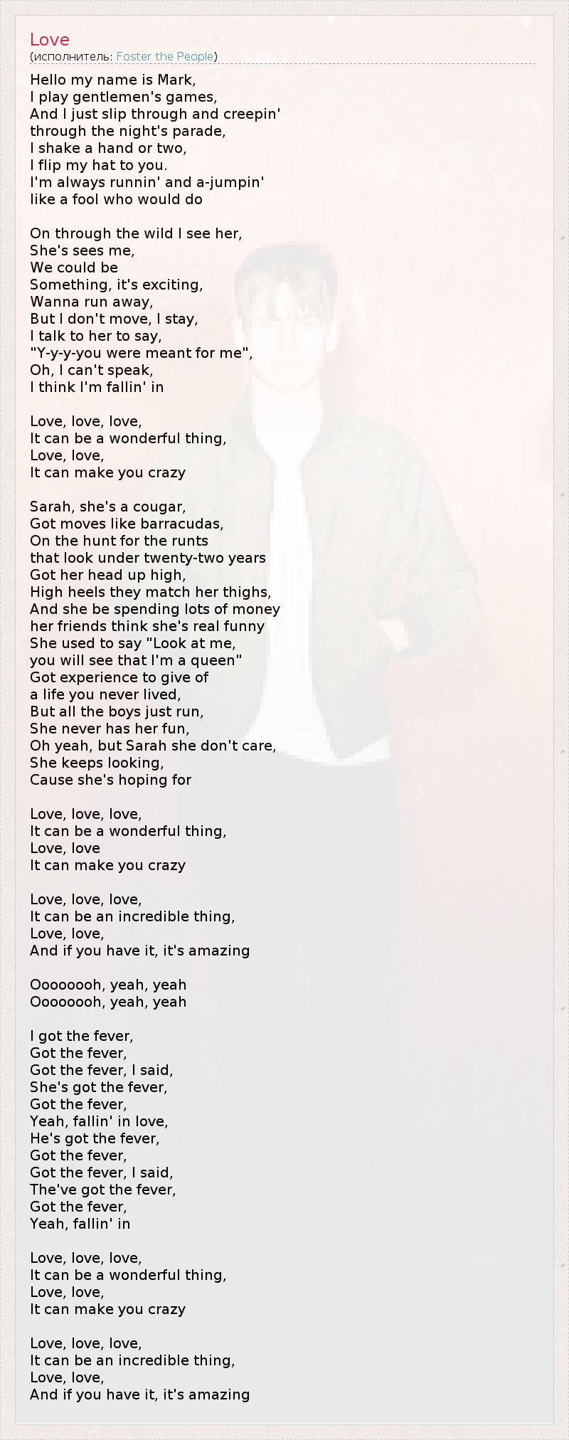 Hello my name is Mark, I play gentlemen's games, And I just slip through and creepin' through the night's parade, I shake a hand or two, I flip my hat to you. I'm always runnin' and a-jumpin' like a fool who would do On through the wild I see her, She's sees me, We could be Something, it's exciting, Wanna run away, But I don't move, I stay, I talk to her to say, "Y-y-y-you were meant for me", Oh, I can't speak, I think I'm fallin' in Love, love, love, It can be a wonderful thing, Love, love, It can make you crazy Sarah, she's a cougar, Got moves like barracudas, On the hunt for the runts that look under twenty-two years Got her head up high, High heels they match her thighs, And she be spending lots of money her friends think she's real funny She used to say "Look at me, you will see that I'm a queen" Got experience to give of a life you never lived, But all the boys just run, She never has her fun, Oh yeah, but Sarah she don't care, She keeps looking, Cause she's hoping for Love, love, love, It can be a wonderful thing, Love, love It can make you crazy Love, love, love, It can be an incredible thing, Love, love, And if you have it, it's amazing Oooooooh, yeah, yeah Oooooooh, yeah, yeah I got the fever, Got the fever, Got the fever, I said, She's got the fever, Got the fever, Yeah, fallin' in love, He's got the fever, Got the fever, Got the fever, I said, The've got the fever, Got the fever, Yeah, fallin' in Love, love, love, It can be a wonderful thing, Love, love, It can make you crazy Love, love, love, It can be an incredible thing, Love, love, And if you have it, it's amazing