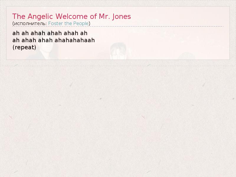 ГлавнаяИсполнителиFoster the PeopleThe Angelic Welcome of Mr. Jones
