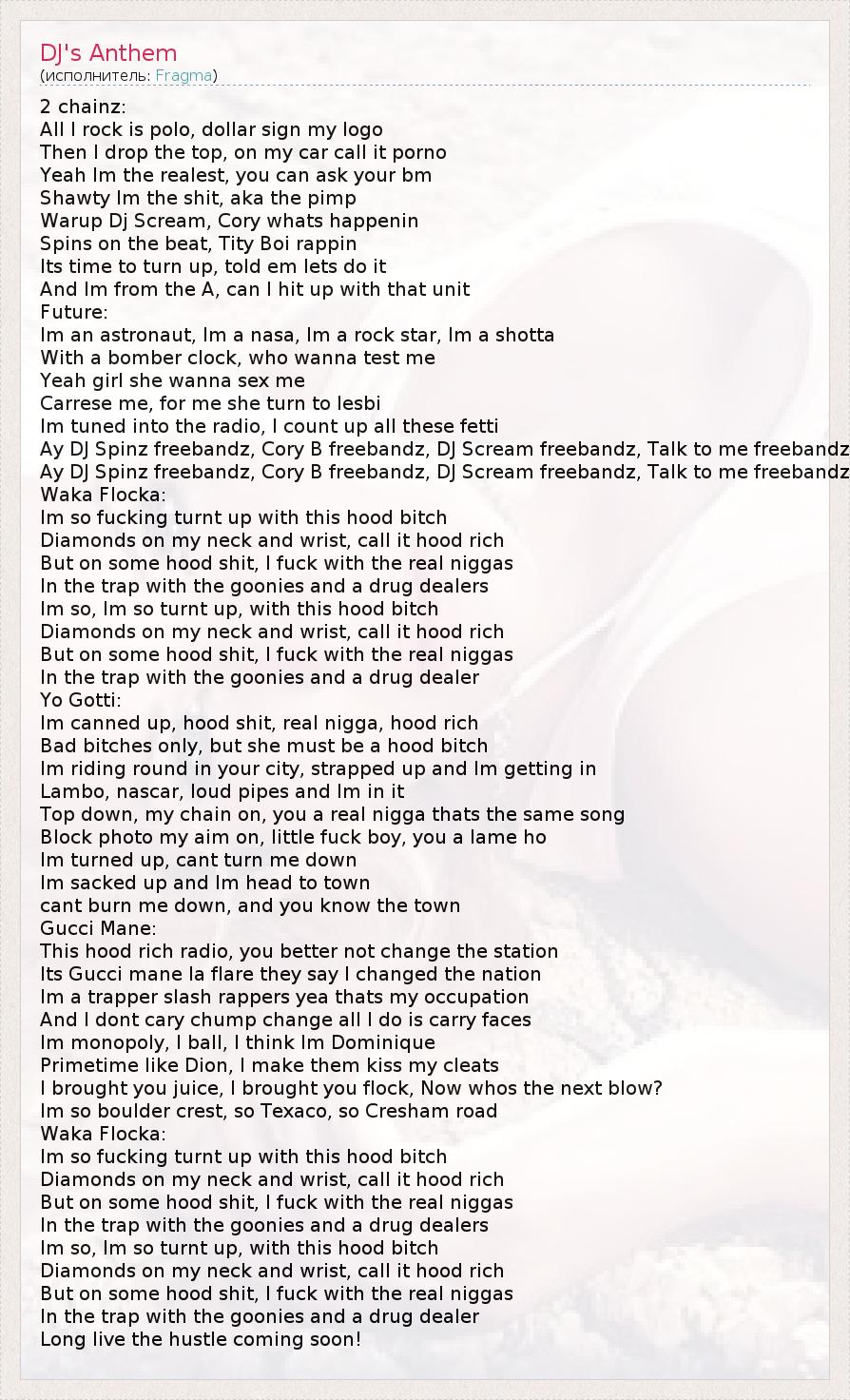 2 chainz: All I rock is polo, dollar sign my logo Then I drop the top, on my car call it porno Yeah Im the realest, you can ask your bm Shawty Im the shit, aka the pimp Warup Dj Scream, Cory whats happenin Spins on the beat, Tity Boi rappin Its time to turn up, told em lets do it And Im from the A, can I hit up with that unit Future: Im an astronaut, Im a nasa, Im a rock star, Im a shotta With a bomber clock, who wanna test me Yeah girl she wanna sex me Carrese me, for me she turn to lesbi Im tuned into the radio, I count up all these fetti Ay DJ Spinz freebandz, Cory B freebandz, DJ Scream freebandz, Talk to me freebandz Ay DJ Spinz freebandz, Cory B freebandz, DJ Scream freebandz, Talk to me freebandz Waka Flocka: Im so fucking turnt up with this hood bitch Diamonds on my neck and wrist, call it hood rich But on some hood shit, I fuck with the real niggas In the trap with the goonies and a drug dealers Im so, Im so turnt up, with this hood bitch Diamonds on my neck and wrist, call it hood rich But on some hood shit, I fuck with the real niggas In the trap with the goonies and a drug dealer Yo Gotti: Im canned up, hood shit, real nigga, hood rich Bad bitches only, but she must be a hood bitch Im riding round in your city, strapped up and Im getting in Lambo, nascar, loud pipes and Im in it Top down, my chain on, you a real nigga thats the same song Block photo my aim on, little fuck boy, you a lame ho Im turned up, cant turn me down Im sacked up and Im head to town cant burn me down, and you know the town Gucci Mane: This hood rich radio, you better not change the station Its Gucci mane la flare they say I changed the nation Im a trapper slash rappers yea thats my occupation And I dont cary chump change all I do is carry faces Im monopoly, I ball, I think Im Dominique Primetime like Dion, I make them kiss my cleats I brought you juice, I brought you flock, Now whos the next blow? Im so boulder crest, so Texaco, so Cresham road Waka Flocka: Im so fucking turnt up with this hood bitch Diamonds on my neck and wrist, call it hood rich But on some hood shit, I fuck with the real niggas In the trap with the goonies and a drug dealers Im so, Im so turnt up, with this hood bitch Diamonds on my neck and wrist, call it hood rich But on some hood shit, I fuck with the real niggas In the trap with the goonies and a drug dealer Long live the hustle coming soon!