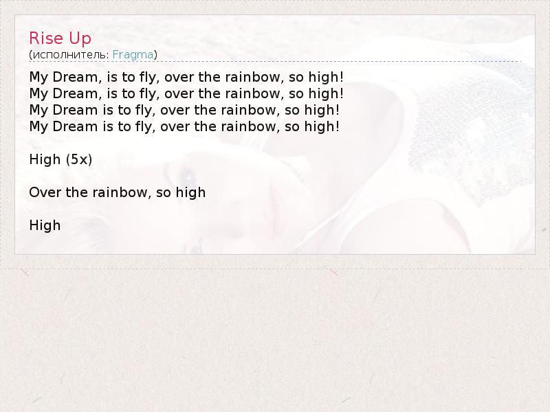 My Dream, is to fly, over the rainbow, so high! My Dream, is to fly, over the rainbow, so high! My Dream is to fly, over the rainbow, so high! My Dream is to fly, over the rainbow, so high! High (5x) Over the rainbow, so high High