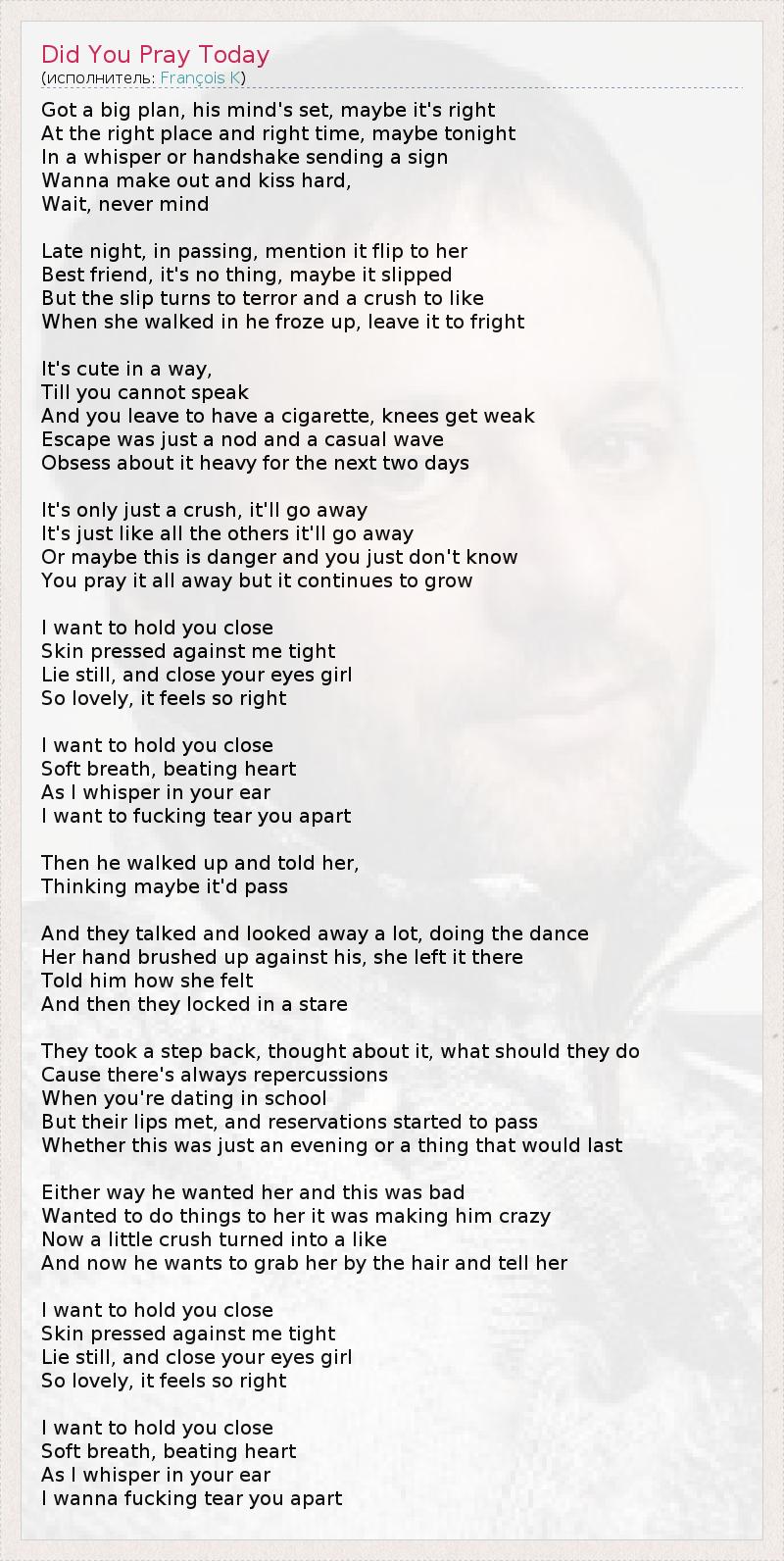 Got a big plan, his mind's set, maybe it's right At the right place and right time, maybe tonight In a whisper or handshake sending a sign Wanna make out and kiss hard, Wait, never mind Late night, in passing, mention it flip to her Best friend, it's no thing, maybe it slipped But the slip turns to terror and a crush to like When she walked in he froze up, leave it to fright It's cute in a way, Till you cannot speak And you leave to have a cigarette, knees get weak Escape was just a nod and a casual wave Obsess about it heavy for the next two days It's only just a crush, it'll go away It's just like all the others it'll go away Or maybe this is danger and you just don't know You pray it all away but it continues to grow I want to hold you close Skin pressed against me tight Lie still, and close your eyes girl So lovely, it feels so right I want to hold you close Soft breath, beating heart As I whisper in your ear I want to fucking tear you apart Then he walked up and told her, Thinking maybe it'd pass And they talked and looked away a lot, doing the dance Her hand brushed up against his, she left it there Told him how she felt And then they locked in a stare They took a step back, thought about it, what should they do Cause there's always repercussions When you're dating in school But their lips met, and reservations started to pass Whether this was just an evening or a thing that would last Either way he wanted her and this was bad Wanted to do things to her it was making him crazy Now a little crush turned into a like And now he wants to grab her by the hair and tell her I want to hold you close Skin pressed against me tight Lie still, and close your eyes girl So lovely, it feels so right I want to hold you close Soft breath, beating heart As I whisper in your ear I wanna fucking tear you apart