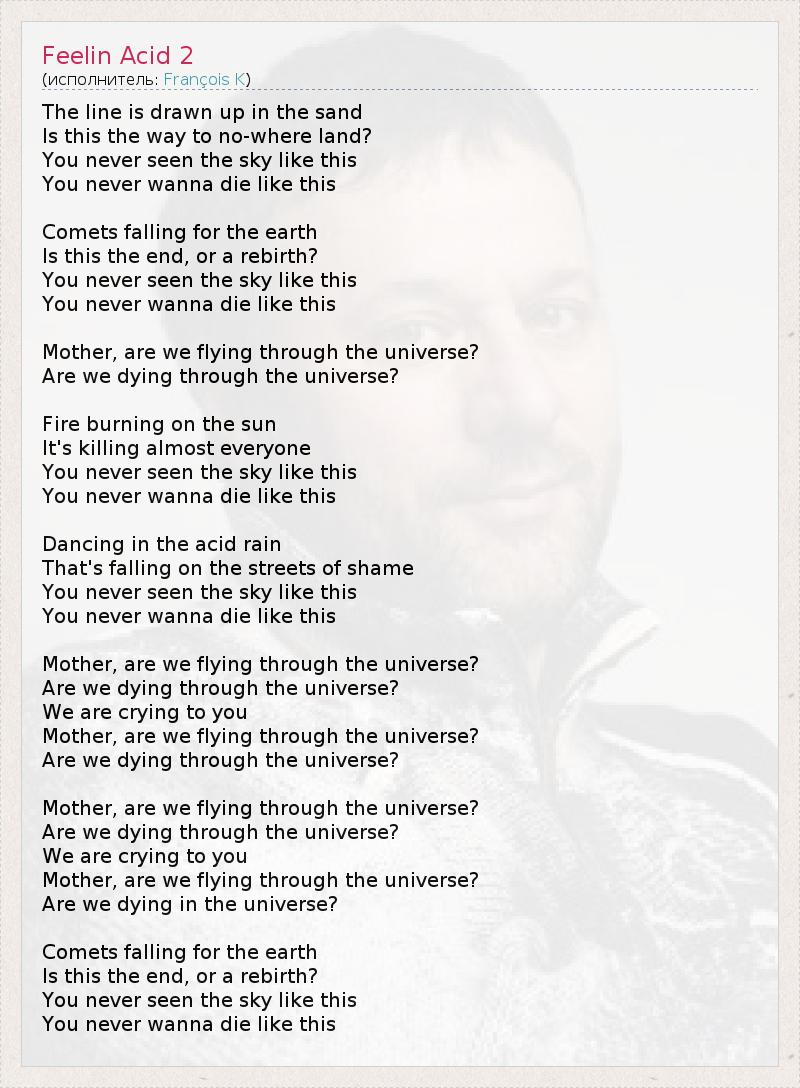 Линия, начертанная на песке, Это путь в никуда? Ты никогда не видел такого неба. Ты никогда не хотел так умереть. Кометы, падающие на землю, Это смерть или перерождение? Ты никогда не видел такого неба. Ты никогда не хотел умереть так. Мама, мы летим через вселенную? Мы умираем во вселенной? Огненные вспышки на солнце Убивают почти каждого. Ты никогда не видел такого неба. Ты никогда не хотел так умереть. Танец под кислотным дождем, Это падение на улицы позора. Ты никогда не видел такого неба. Ты никогда не хотел так умереть. Мама, мы летим через вселенную? Мы умираем во вселенной? Мы кричим тебе, мама: Мама, мы летим через вселенную? Мы умираем во вселенной? Мама, мы летим через вселенную? Мы умираем во вселенной? Мы кричим тебе, мама: Мама, мы летим через вселенную? Мы умираем во вселенной? Огненные вспышки на солнце Убивают почти каждого. Ты никогда не видел такого неба. Ты никогда не хотел так умереть.