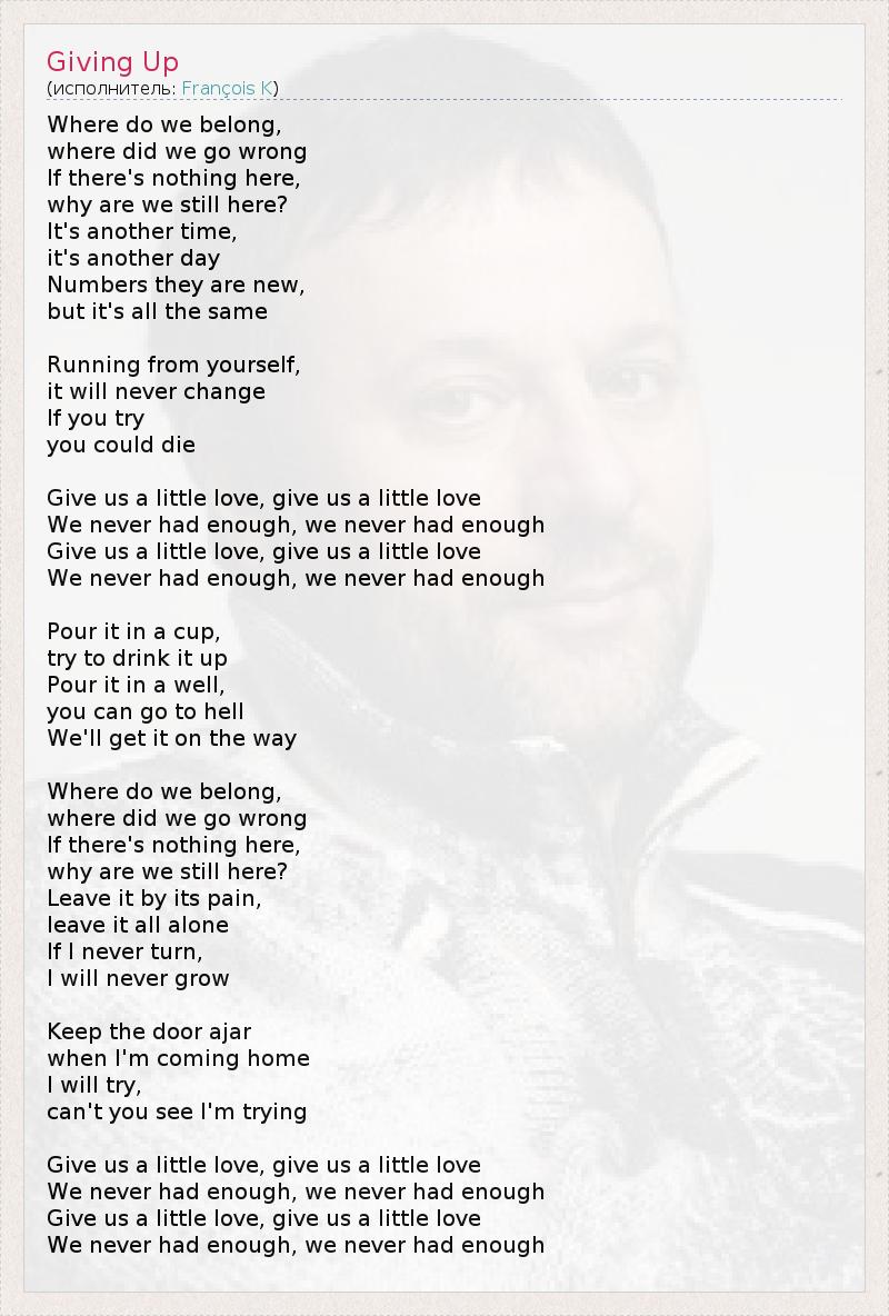 Where do we belong, where did we go wrong If there's nothing here, why are we still here? It's another time, it's another day Numbers they are new, but it's all the same Running from yourself, it will never change If you try you could die Give us a little love, give us a little love We never had enough, we never had enough Give us a little love, give us a little love We never had enough, we never had enough Pour it in a cup, try to drink it up Pour it in a well, you can go to hell We'll get it on the way Where do we belong, where did we go wrong If there's nothing here, why are we still here? Leave it by its pain, leave it all alone If I never turn, I will never grow Keep the door ajar when I'm coming home I will try, can't you see I'm trying Give us a little love, give us a little love We never had enough, we never had enough Give us a little love, give us a little love We never had enough, we never had enough