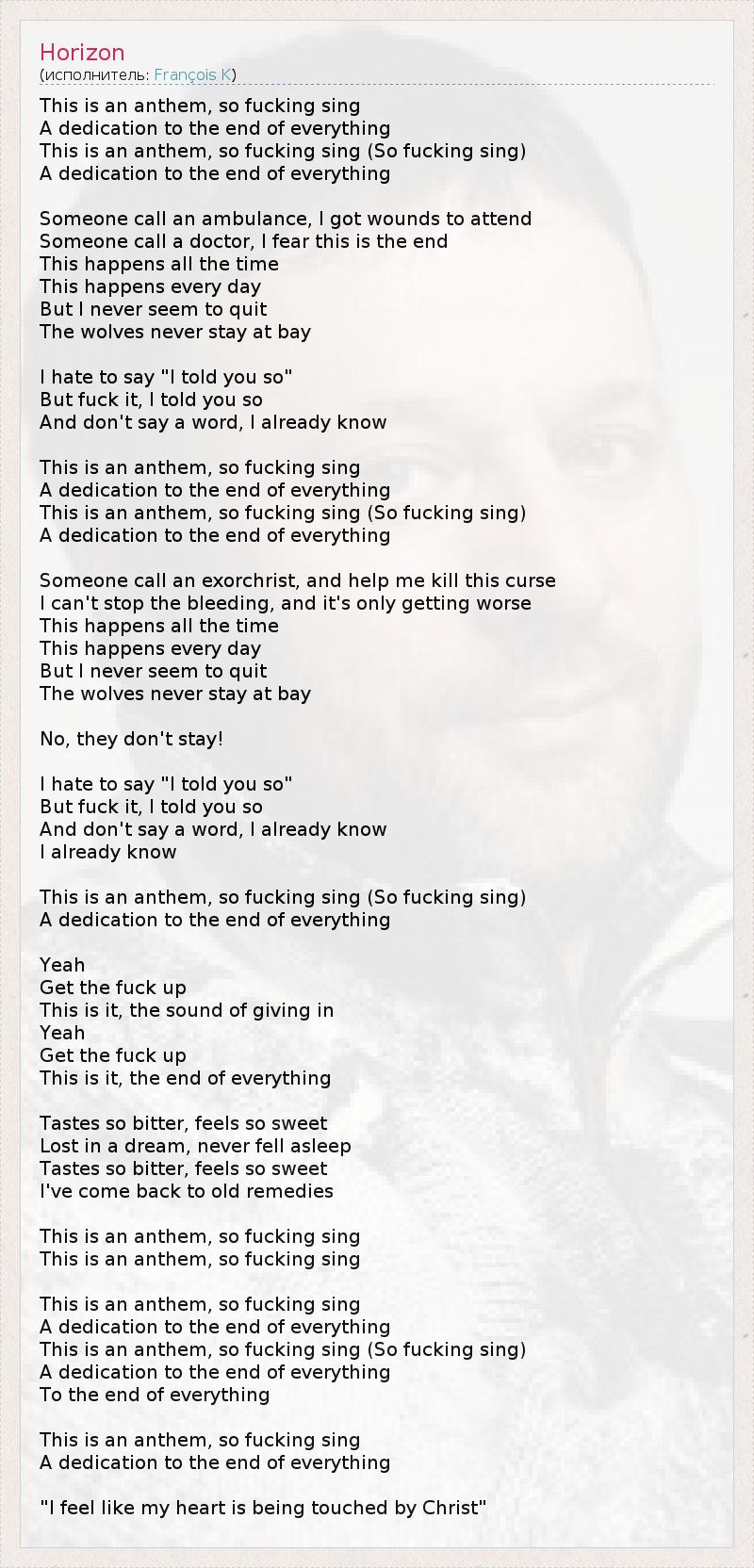 This is an anthem, so fucking sing A dedication to the end of everything This is an anthem, so fucking sing (So fucking sing) A dedication to the end of everything Someone call an ambulance, I got wounds to attend Someone call a doctor, I fear this is the end This happens all the time This happens every day But I never seem to quit The wolves never stay at bay I hate to say "I told you so" But fuck it, I told you so And don't say a word, I already know This is an anthem, so fucking sing A dedication to the end of everything This is an anthem, so fucking sing (So fucking sing) A dedication to the end of everything Someone call an exorchrist, and help me kill this curse I can't stop the bleeding, and it's only getting worse This happens all the time This happens every day But I never seem to quit The wolves never stay at bay No, they don't stay! I hate to say "I told you so" But fuck it, I told you so And don't say a word, I already know I already know This is an anthem, so fucking sing (So fucking sing) A dedication to the end of everything Yeah Get the fuck up This is it, the sound of giving in Yeah Get the fuck up This is it, the end of everything Tastes so bitter, feels so sweet Lost in a dream, never fell asleep Tastes so bitter, feels so sweet I've come back to old remedies This is an anthem, so fucking sing This is an anthem, so fucking sing This is an anthem, so fucking sing A dedication to the end of everything This is an anthem, so fucking sing (So fucking sing) A dedication to the end of everything To the end of everything This is an anthem, so fucking sing A dedication to the end of everything "I feel like my heart is being touched by Christ"