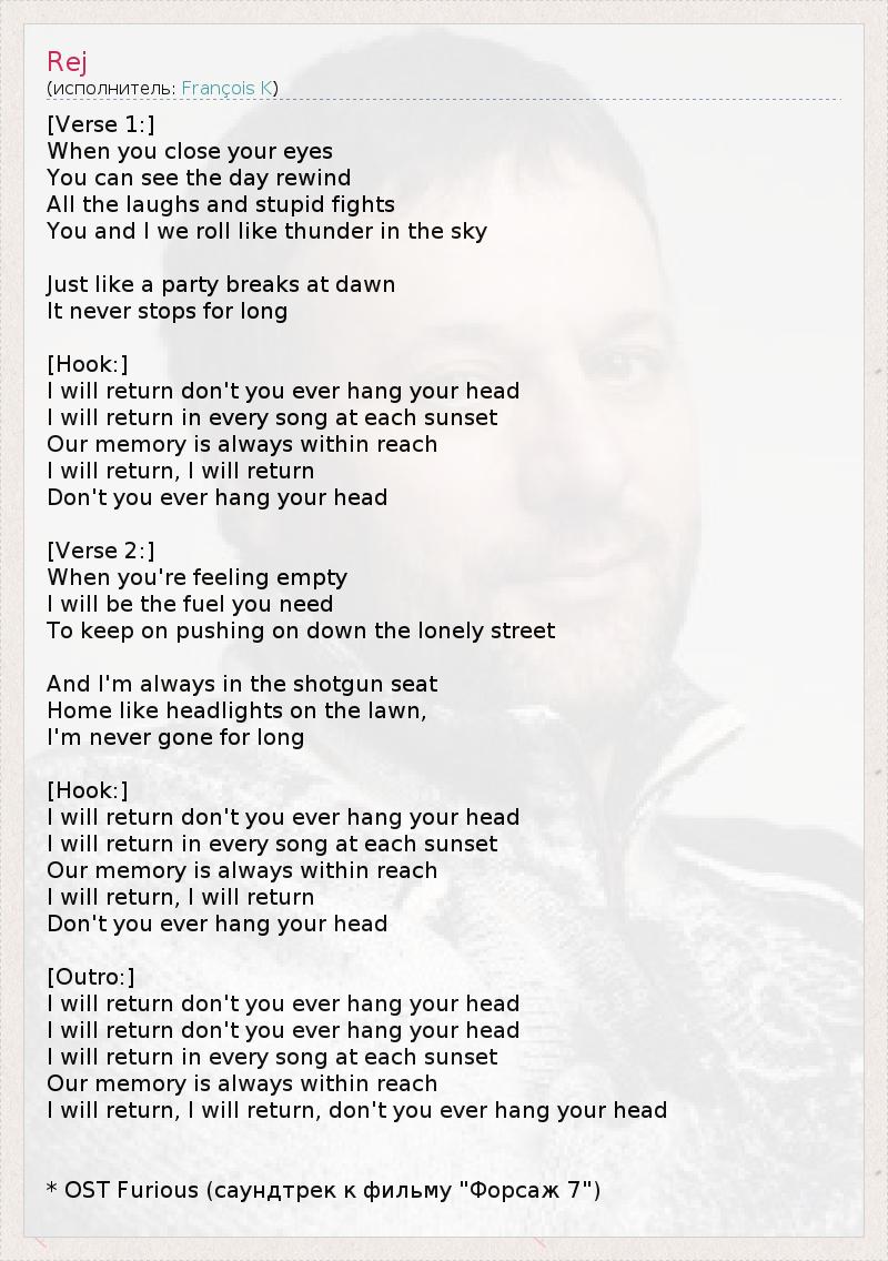 [Verse 1:] When you close your eyes You can see the day rewind All the laughs and stupid fights You and I we roll like thunder in the sky Just like a party breaks at dawn It never stops for long [Hook:] I will return don't you ever hang your head I will return in every song at each sunset Our memory is always within reach I will return, I will return Don't you ever hang your head [Verse 2:] When you're feeling empty I will be the fuel you need To keep on pushing on down the lonely street And I'm always in the shotgun seat Home like headlights on the lawn, I'm never gone for long [Hook:] I will return don't you ever hang your head I will return in every song at each sunset Our memory is always within reach I will return, I will return Don't you ever hang your head [Outro:] I will return don't you ever hang your head I will return don't you ever hang your head I will return in every song at each sunset Our memory is always within reach I will return, I will return, don't you ever hang your head * OST Furious (саундтрек к фильму "Форсаж 7")