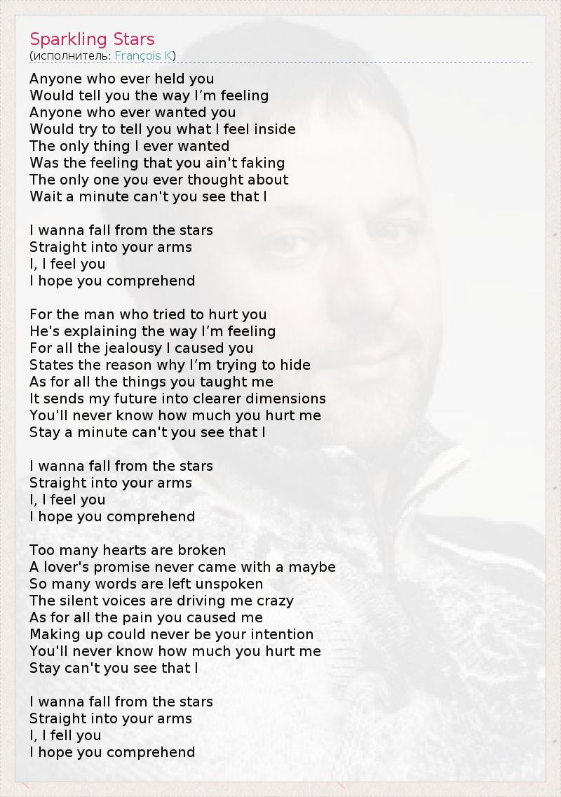 Любой, кто хоть однажды обнимал тебя, Скажет тебе, что я чувствую. Любой, кто хоть когда-нибудь хотел тебя, Постарается описать тебе, что я чувствую. Единственное, что я когда-либо хотел, Это чувствовать, что ты не фальшивка. Единственное, о чем ты когда-либо думала... Подожди-ка минутку, разве ты не видишь, что я... Я хочу упасть со звезд Прямо в твои объятья. Я, я чувствую тебя, Я надеюсь, что ты понимаешь это... Тот, кто пытался обидеть тебя, Он объяснит, что я чувствую. Вся моя ревность к тебе Объясняет, почему я пытаюсь спрятаться. Все, чему ты научила меня, Дало четкое направление моему будущему. Ты, никогда, не узнаешь, сколько боли причинила мне! Подожди-ка минутку, разве ты не видишь, что я... Я хочу упасть со звезд Прямо в твои объятья. Я, я чувствую тебя, Я надеюсь, что ты понимаешь это... Слишком много сердец разбито, Любовные обещания никогда не даются со словом «ВОЗМОЖНО». Так много слов осталось несказанными. Молчание сводит меня с ума. Что касается всей боли, что ты причинила мне, Так созидание никогда и не входило в твои планы. Ты, никогда, не узнаешь, сколько боли причинила мне! Подожди-ка минутку, разве ты не видишь, что я... Я хочу упасть со звезд Прямо в твои объятья. Я, я чувствую тебя, Я надеюсь, что ты понимаешь это...