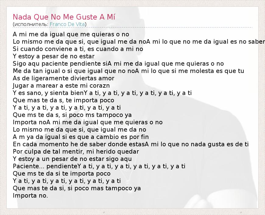 ГлавнаяИсполнителиFranco De VitaNada Que No Me Guste A Mí