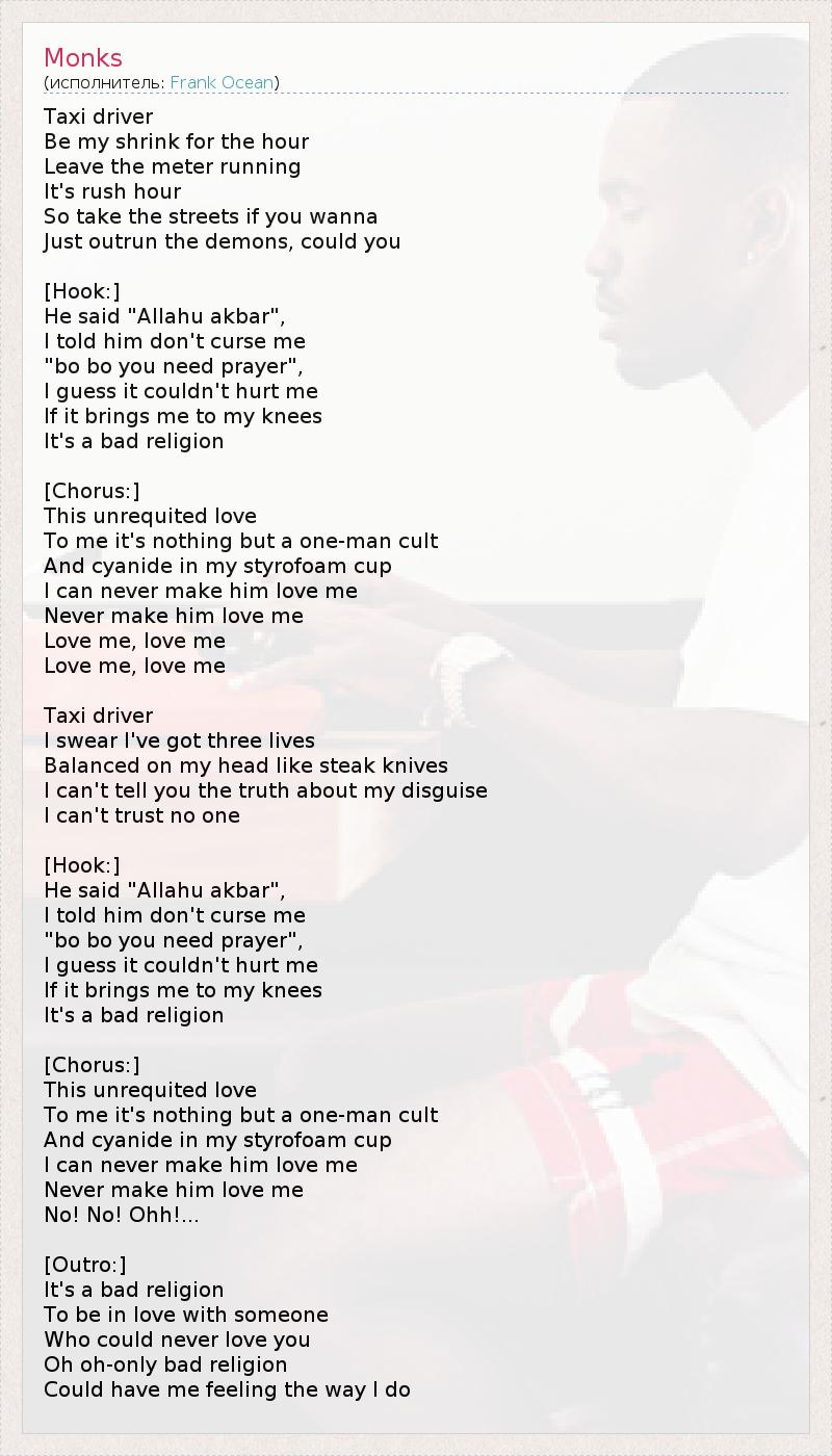 Часто бывает, что исполнители обращаются за помощью к так называемым «безымянным авторам» - авторам, которые пишут музыку, но официально их имена не появляются на обложках. Одним из таких теневых композиторов был Фрэнк Оушен (полное имя Кристофер Фрэнсис Оушен). И, между прочим, справлялся он со своей задачей просто отлично. В 2005 году, после трагических событий, вызванных ураганом Катрина, Фрэнк переехал из Нового Орлеана в Лос-Анджелес. Этот город, как известно, является своего рода Меккой для артистов, музыкантов и всевозможных творческих и неординарных личностей. Благодаря своему таланту Оушен сумел довольно быстро заручиться поддержкой именитых исполнителей и даже начал сотрудничать непосредственно с ними. Судите сами: молодой парень уже успел поработать с Брэнди Норвуд, Джастином Бибером и даже Джоном Леджендом. Неплохой послужной список для двадцатичетырехлетнего композитора, неправда ли? Впрочем, настало время, когда Фрэнк Оушен решился на серьезный шаг, которого с нетерпением ждали меломаны. Исполнитель подготовил сольный лонгплей, получивший название channel ORANGE. Он стал сольным дебютом Фрэнка, поэтому особенно интересно познакомиться с альбомом.