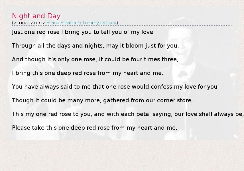 Это интересно:Синатра в январе 1940 принял заманчивое предложение от Томми Дорси (Tommy Dorsey). Под аккомпанемент биг-бэнда Дорси Синатра записал целую обойму необыкновенно популярных песен, 16 из которых в течение двух лет побывали в первой десятке хитов. Наиболее значительная веха этого периода — композиция "I'll Never Smile Again", тогдашний хит #1, а в будущем — участник Зала славы Grammy. Если верить признанию... продолжение