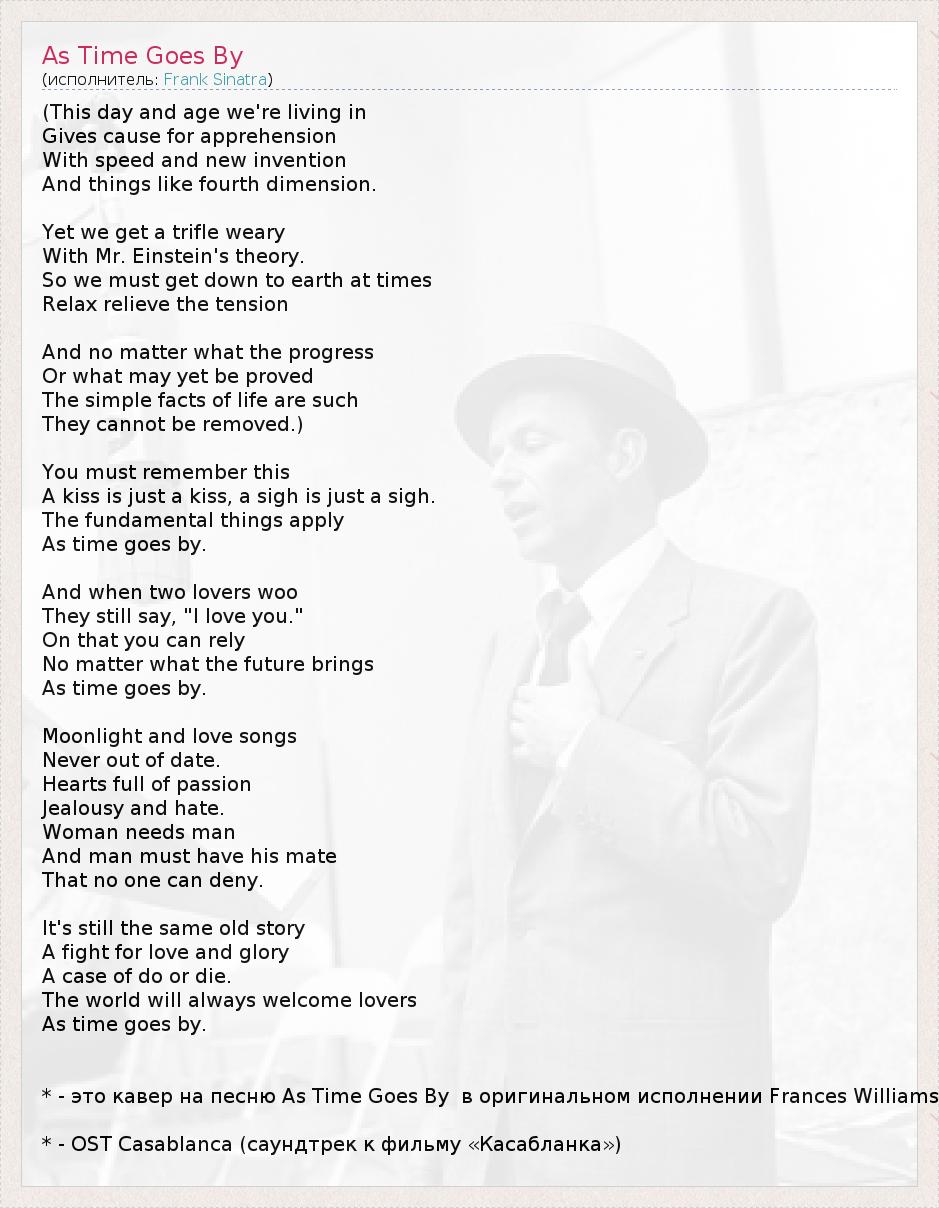 (This day and age we're living in Gives cause for apprehension With speed and new invention And things like fourth dimension. Yet we get a trifle weary With Mr. Einstein's theory. So we must get down to earth at times Relax relieve the tension And no matter what the progress Or what may yet be proved The simple facts of life are such They cannot be removed.) You must remember this A kiss is just a kiss, a sigh is just a sigh. The fundamental things apply As time goes by. And when two lovers woo They still say, "I love you." On that you can rely No matter what the future brings As time goes by. Moonlight and love songs Never out of date. Hearts full of passion Jealousy and hate. Woman needs man And man must have his mate That no one can deny. It's still the same old story A fight for love and glory A case of do or die. The world will always welcome lovers As time goes by. * - это кавер на песню As Time Goes By в оригинальном исполнении Frances Williams * - OST Casablanca (саундтрек к фильму «Касабланка»)