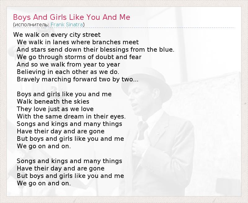 ГлавнаяИсполнителиFrank SinatraBoys And Girls Like You And Me