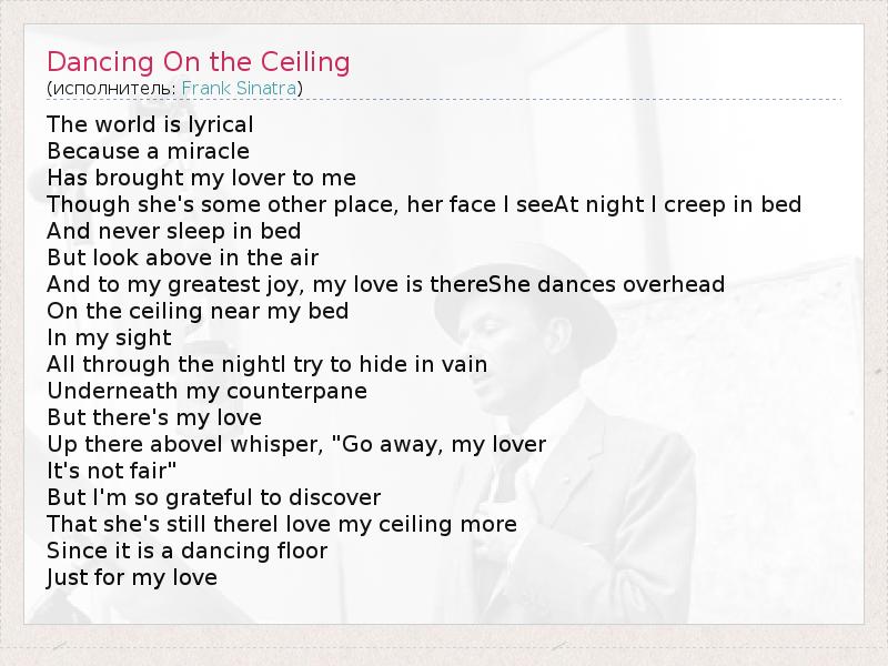 The world is lyrical Because a miracle Has brought my lover to me Though she's some other place, her face I seeAt night I creep in bed And never sleep in bed But look above in the air And to my greatest joy, my love is thereShe dances overhead On the ceiling near my bed In my sight All through the nightI try to hide in vain Underneath my counterpane But there's my love Up there aboveI whisper, "Go away, my lover It's not fair" But I'm so grateful to discover That she's still thereI love my ceiling more Since it is a dancing floor Just for my love