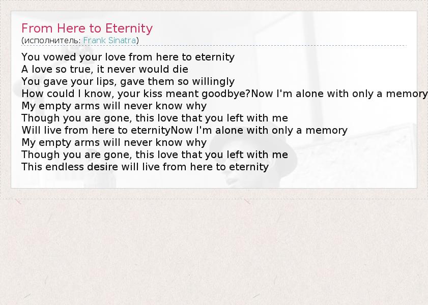 You vowed your love from here to eternity A love so true, it never would die You gave your lips, gave them so willingly How could I know, your kiss meant goodbye?Now I'm alone with only a memory My empty arms will never know why Though you are gone, this love that you left with me Will live from here to eternityNow I'm alone with only a memory My empty arms will never know why Though you are gone, this love that you left with me This endless desire will live from here to eternity
