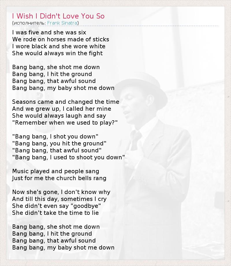 I was five and she was six We rode on horses made of sticks I wore black and she wore white She would always win the fight Bang bang, she shot me down Bang bang, I hit the ground Bang bang, that awful sound Bang bang, my baby shot me down Seasons came and changed the time And we grew up, I called her mine She would always laugh and say "Remember when we used to play?" "Bang bang, I shot you down" "Bang bang, you hit the ground" "Bang bang, that awful sound" "Bang bang, I used to shoot you down" Music played and people sang Just for me the church bells rang Now she's gone, I don't know why And till this day, sometimes I cry She didn't even say "goodbye" She didn't take the time to lie Bang bang, she shot me down Bang bang, I hit the ground Bang bang, that awful sound Bang bang, my baby shot me down