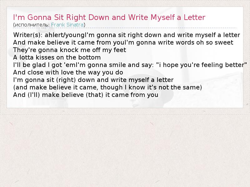 Writer(s): ahlert/youngI'm gonna sit right down and write myself a letter And make believe it came from youI'm gonna write words oh so sweet They're gonna knock me off my feet A lotta kisses on the bottom I'll be glad I got 'emI'm gonna smile and say: "i hope you're feeling better" And close with love the way you do I'm gonna sit (right) down and write myself a letter (and make believe it came, though I know it's not the same) And (I'll) make believe (that) it came from you